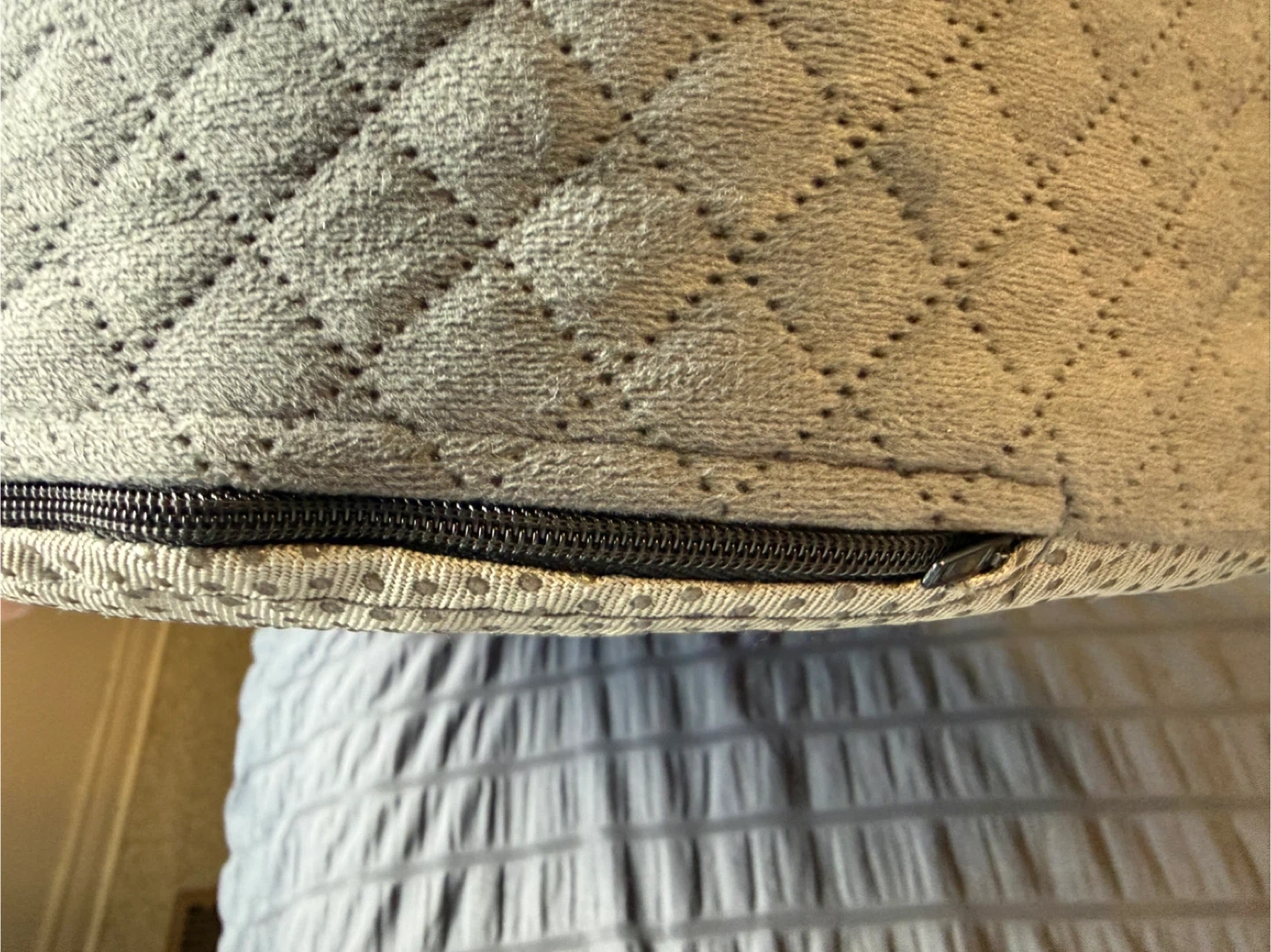 This comfortable seat cushion measures 19 inches by 17 inches and is 3 inches thick. It's made with a soft, quilted grey fabric on top and a grippy beige fabric on the bottom. Includes a convenient carrying handle. Great for adding extra comfort to chairs, sofas, or car seats!