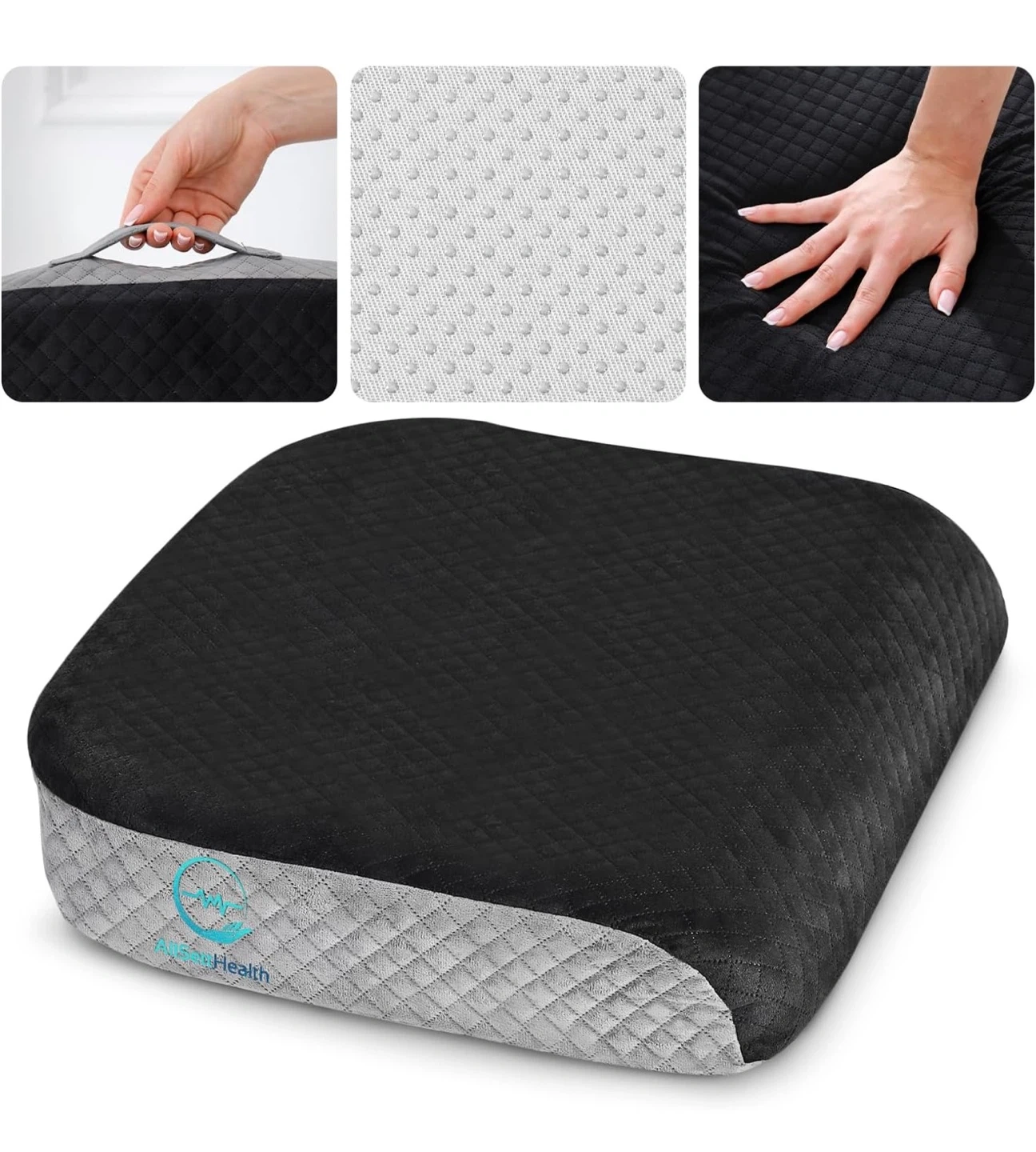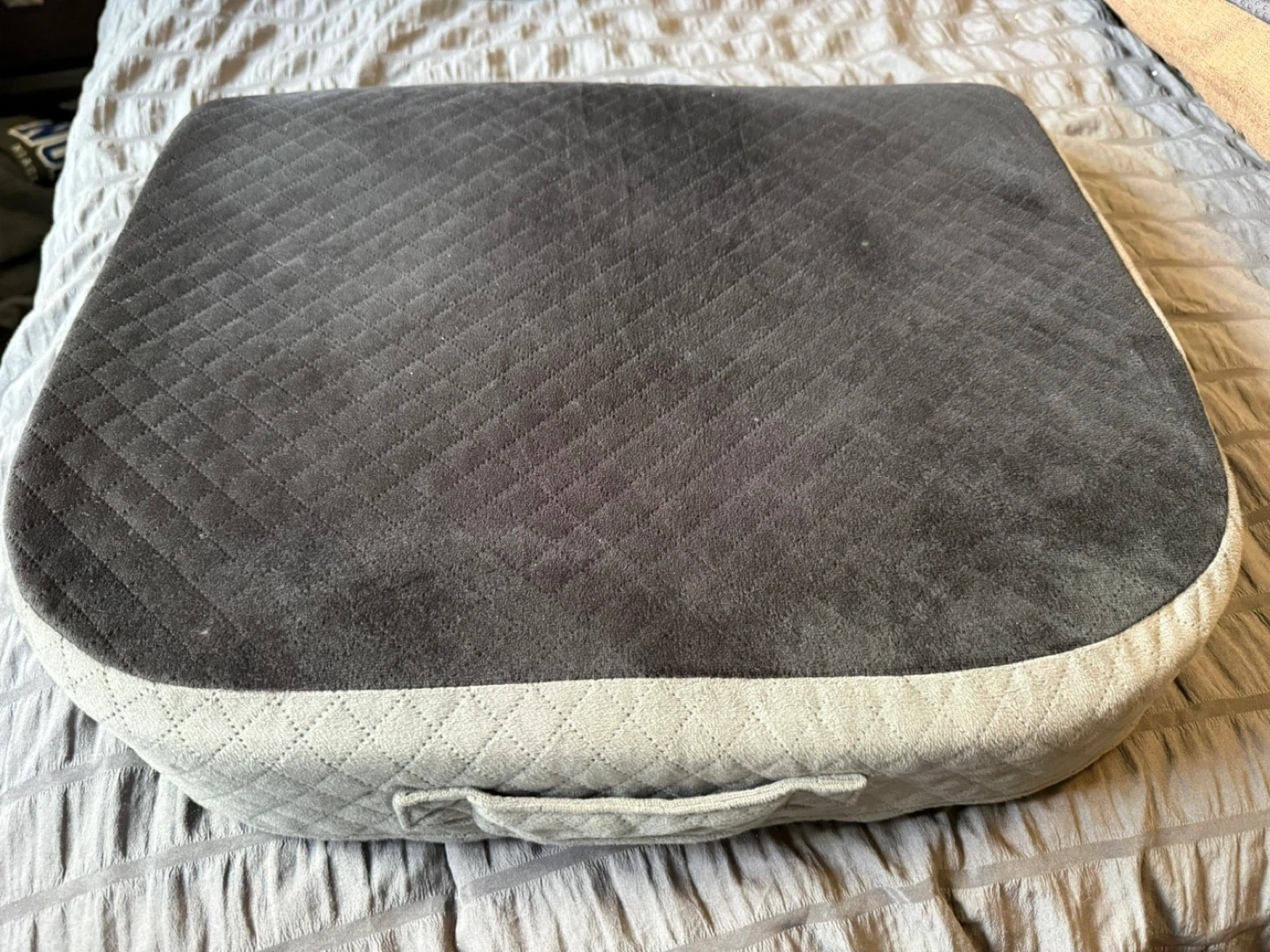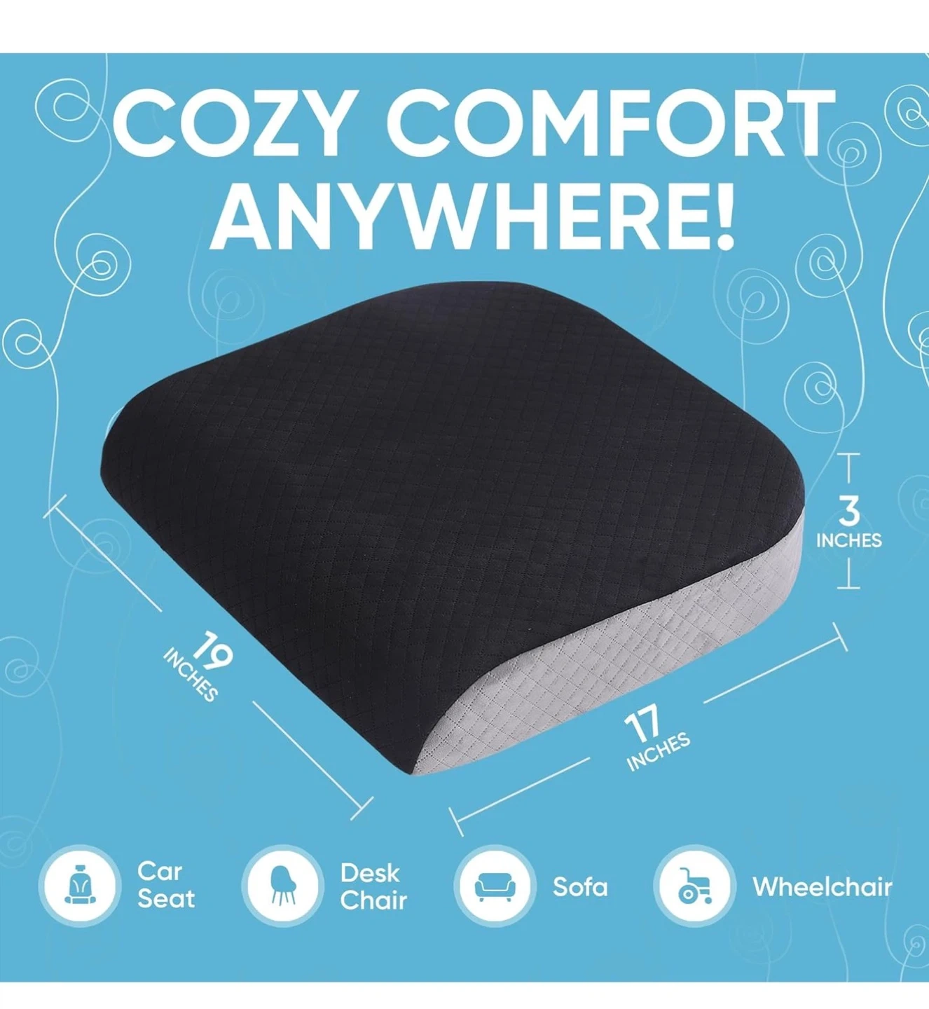 This comfortable seat cushion measures 19 inches by 17 inches and is 3 inches thick. It's made with a soft, quilted grey fabric on top and a grippy beige fabric on the bottom. Includes a convenient carrying handle. Great for adding extra comfort to chairs, sofas, or car seats!