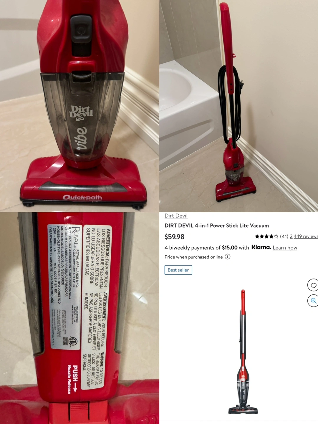 Selling a Dirt Devil Vibe Quickpath stick vacuum in red and black. It's a lightweight and easy-to-use vacuum, perfect for quick cleanups around the house. Originally bought for $59.98.