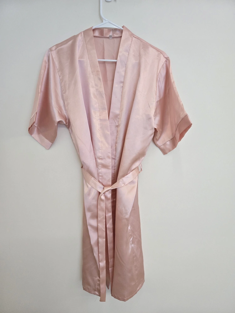 Pink satin robe in excellent condition. It's a size XXL from Asia but fits North American small- medium and features a matching belt. Perfect for lounging or getting ready