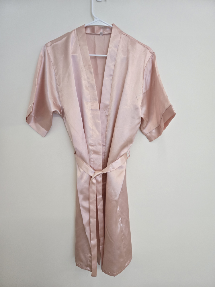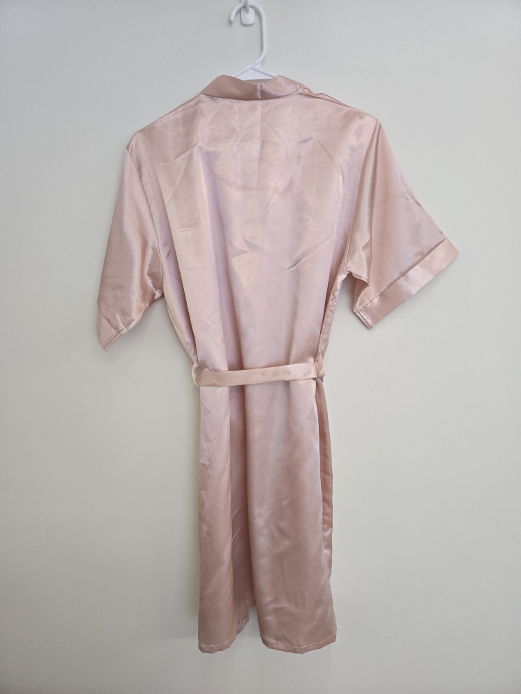 Pink satin robe in excellent condition. It's a size XXL from Asia but fits North American small- medium and features a matching belt. Perfect for lounging or getting ready