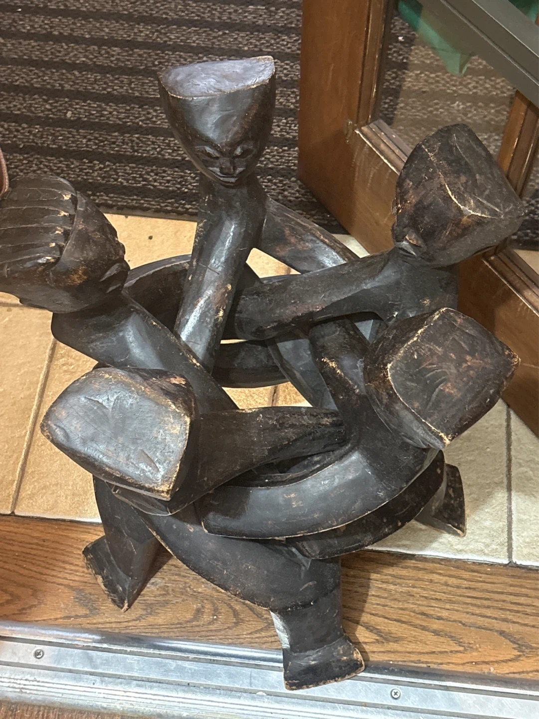 This is a dark, carved wooden sculpture depicting several figures intertwined. It's made of solid wood. This piece would add a unique decorative plant stand this is approximately 35 years old