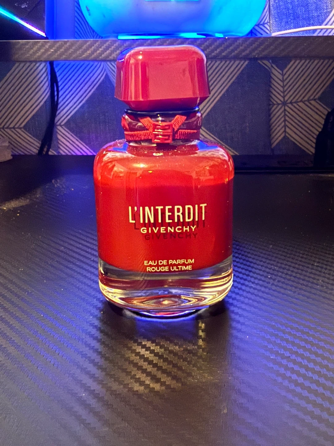 This is Givenchy L'Interdit Rouge Ultime Eau de Parfum for Women. It's a vibrant red fragrance in a glass bottle. The bottle design is elegant and sophisticated, perfect for any collection.