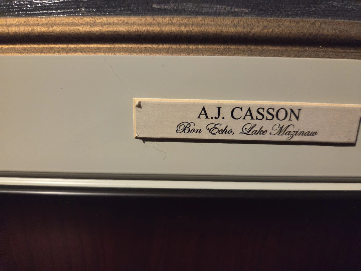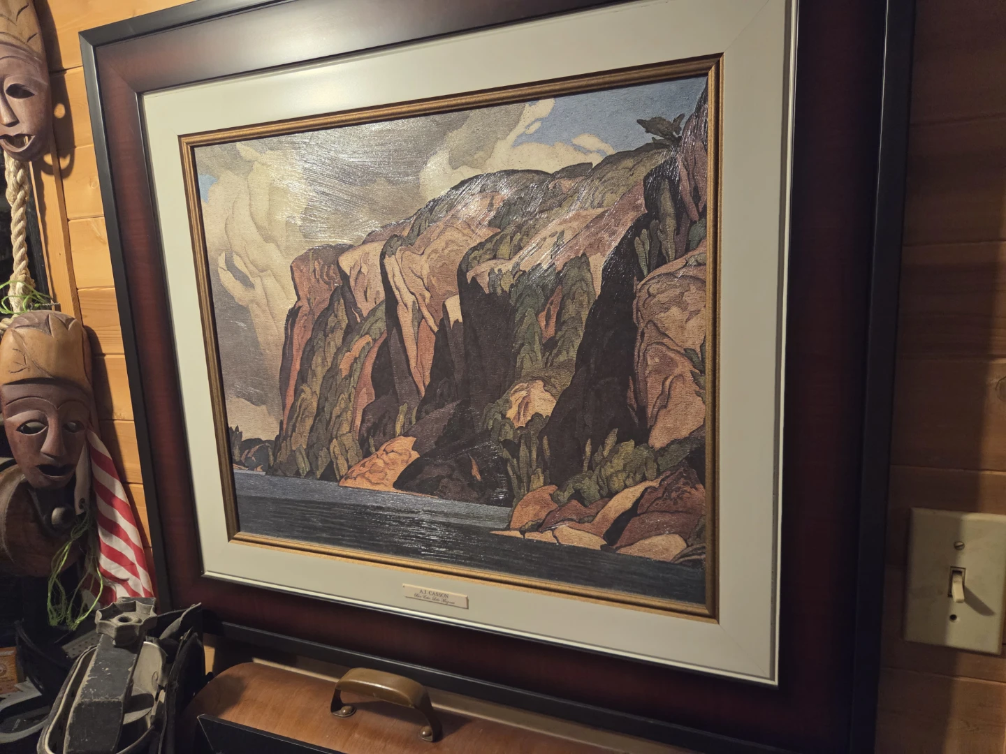 Framed print of A.J. Casson's landscape painting, 'Bon Echo, Lake Manitou'. Alfred Joseph Casson was a renowned Canadian landscape painter. It's a striking depiction of a Canadian natural scene. This piece would be a lovely addition to a home or office.