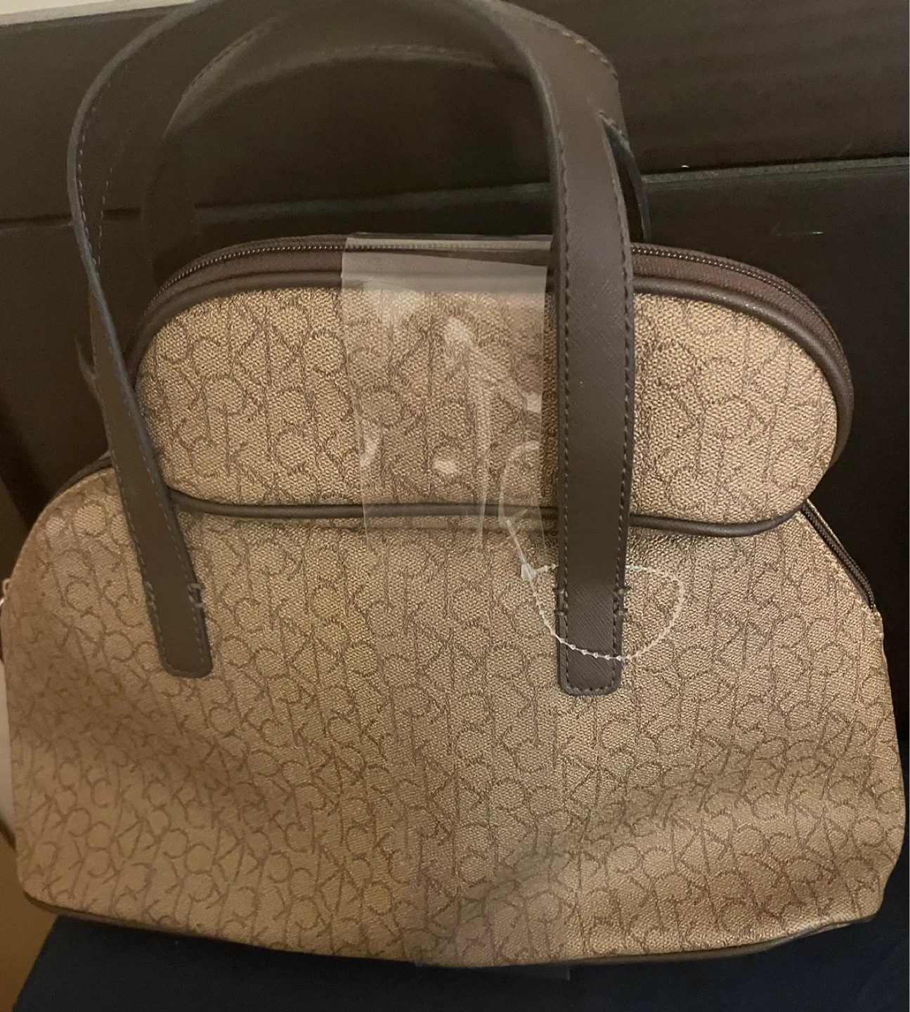 Calvin Klein signature monogram handbag with tags. Features a zip-top closure and dual top handles. Comes with a removable pouch which can be used for makeup. Light brown with dark brown dual handles.