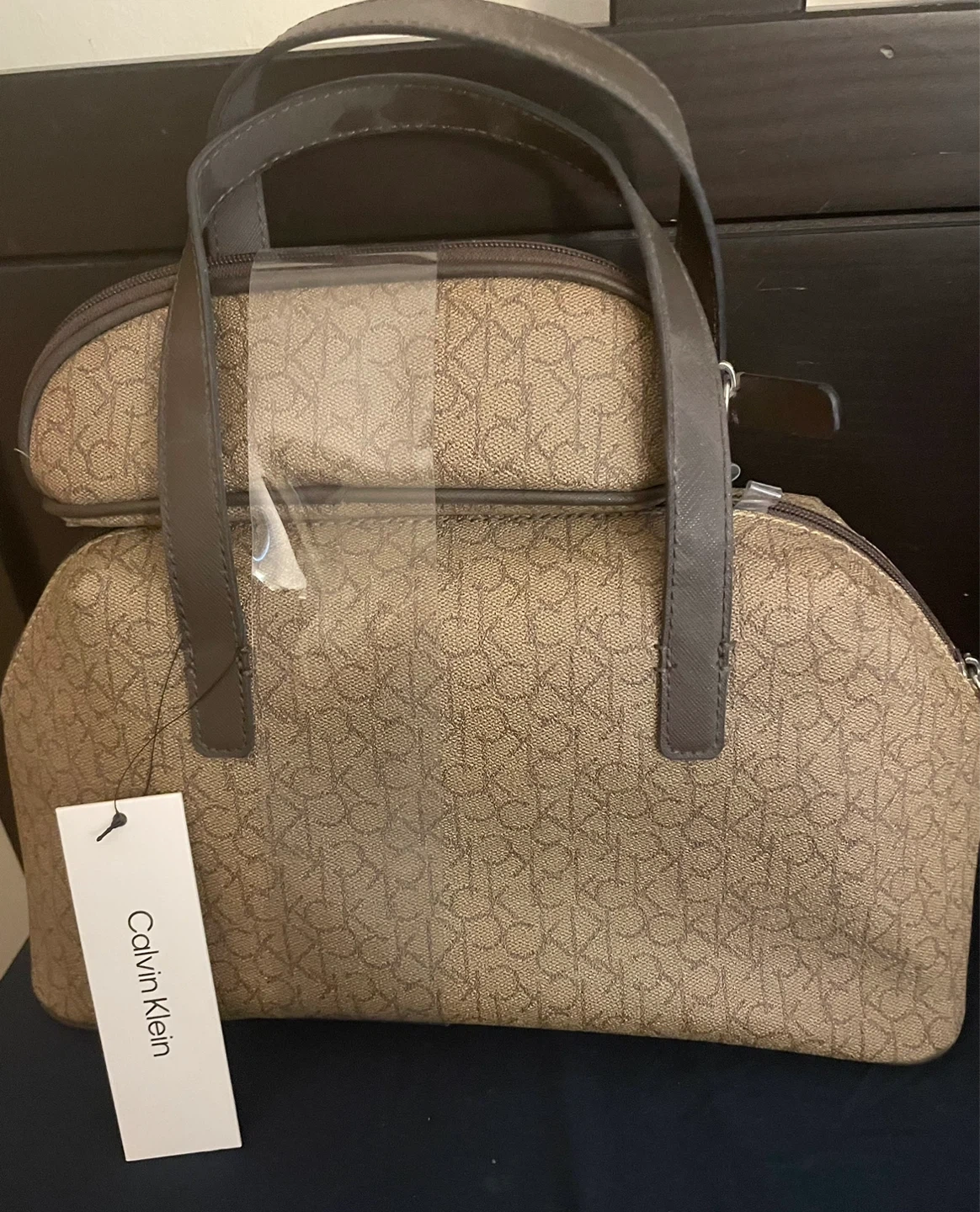 Calvin Klein signature monogram handbag with tags. Features a zip-top closure and dual top handles. Comes with a removable pouch which can be used for makeup. Light brown with dark brown dual handles.