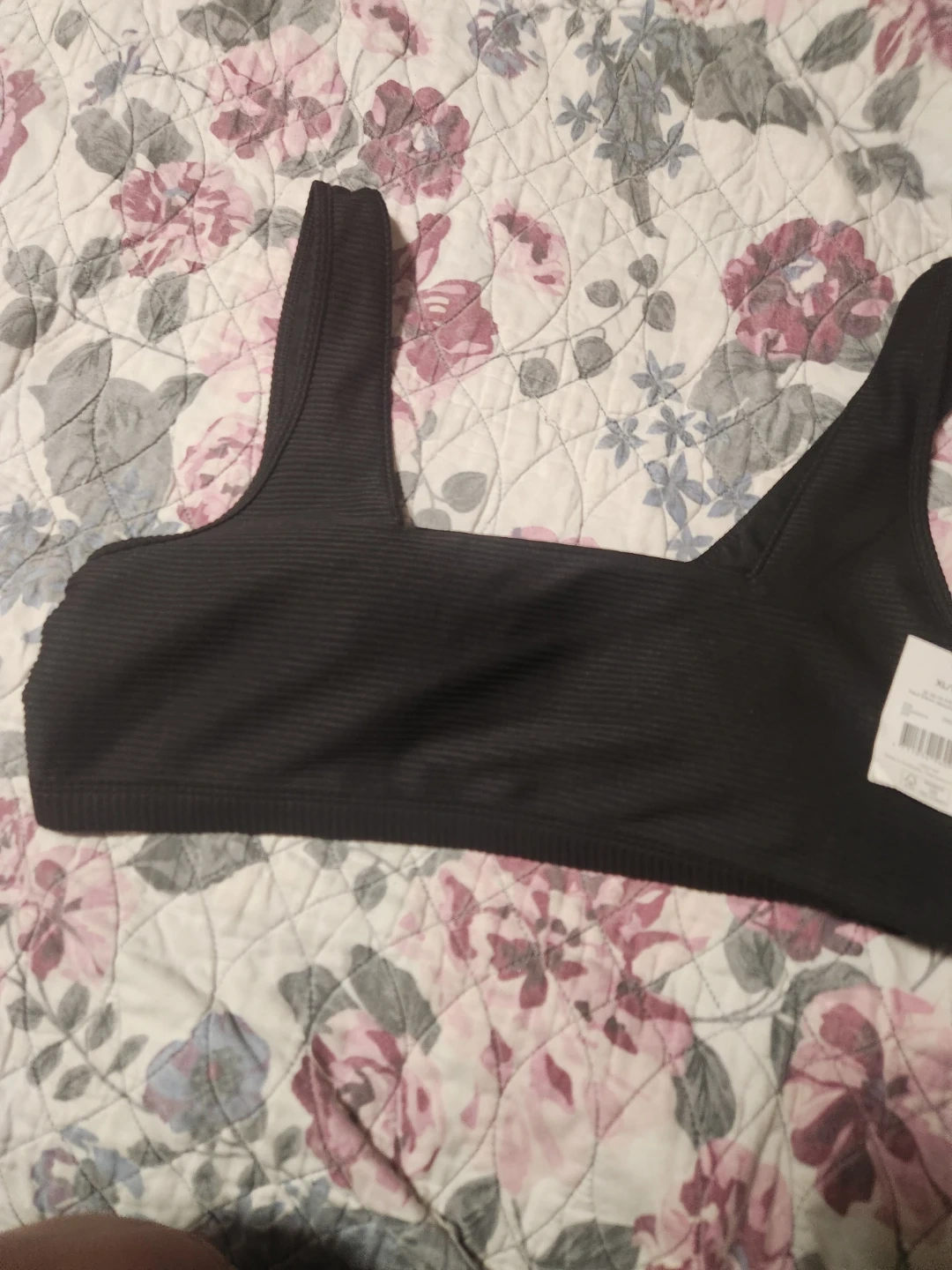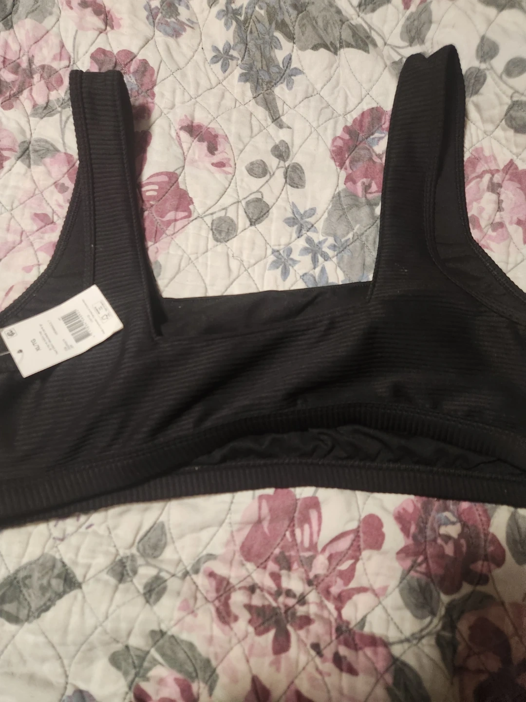 Black ribbed bikini top with a square neckline. It's made of a stretchy fabric blend. This top is great for beach days or poolside lounging. Price is firm. Pick up midland and Danforth or 401 bay street