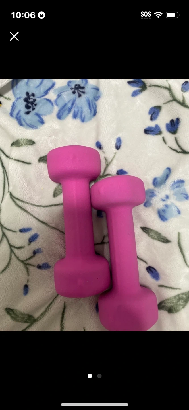 A pair of pink dumbbells. These are ideal for light workouts or toning exercises. The neoprene coating offers a comfortable grip. Pick up cash only