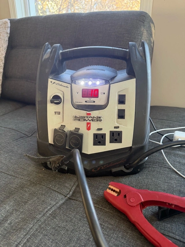 Selling a Schumacher Instant Power Jump Starter & Portable Power Source that’s partially functional. The USB ports work properly, the digital display lights up, and the indicator lights flash. It’s missing the original charging adapter, and the AC outlets and 12V DC ports don’t output power. The internal battery condition is unknown, and the booster cables haven’t been tested. This is ideal for a DIY-minded buyer who can fix it up, use it for parts, or repurpose the working components.