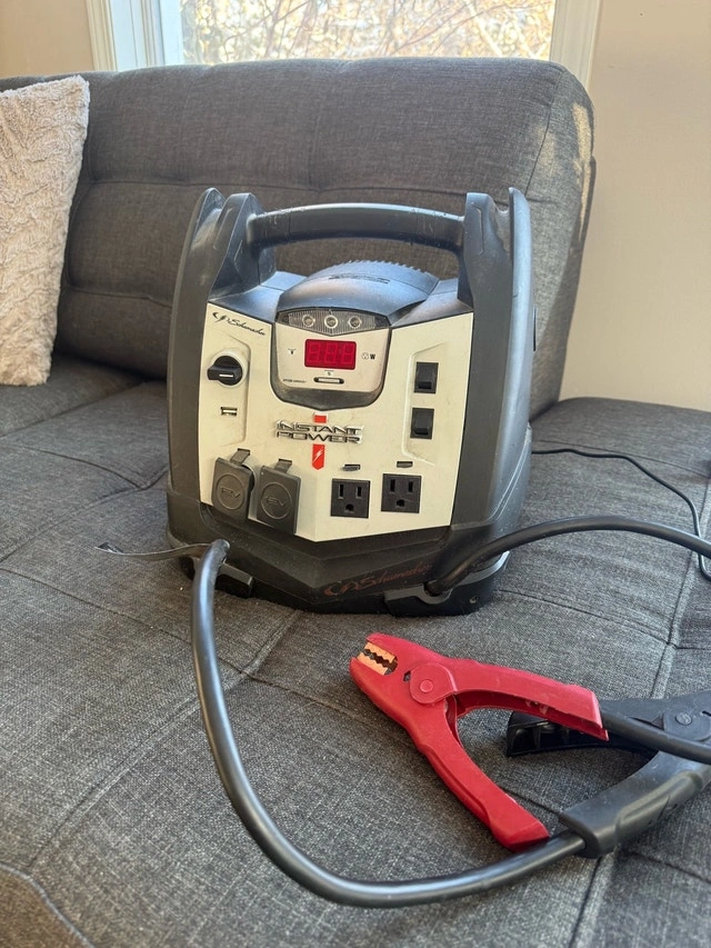 Selling a Schumacher Instant Power Jump Starter & Portable Power Source that’s partially functional. The USB ports work properly, the digital display lights up, and the indicator lights flash. It’s missing the original charging adapter, and the AC outlets and 12V DC ports don’t output power. The internal battery condition is unknown, and the booster cables haven’t been tested. This is ideal for a DIY-minded buyer who can fix it up, use it for parts, or repurpose the working components.