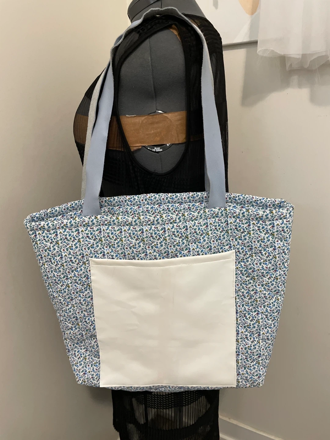 A quilted tote bag featuring a small floral print with light blue straps. It has a white pocket on the front. Great for everyday use!
