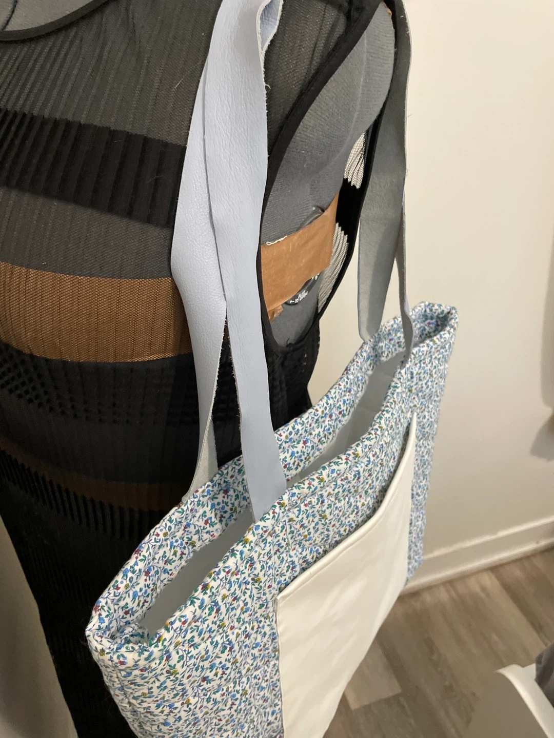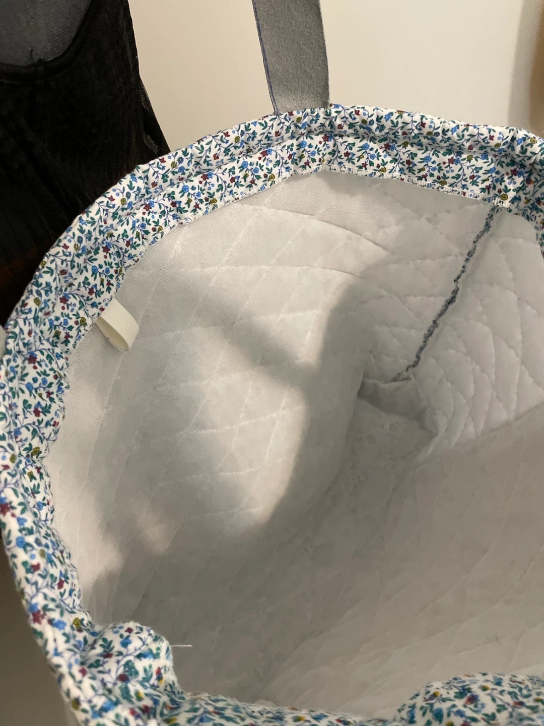 A quilted tote bag featuring a small floral print with light blue straps. It has a white pocket on the front. Great for everyday use!