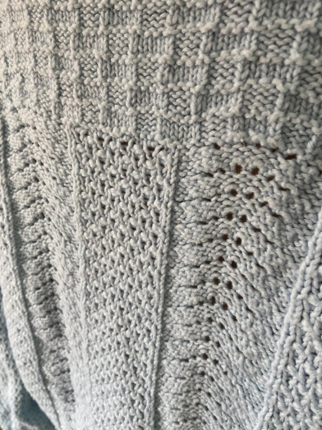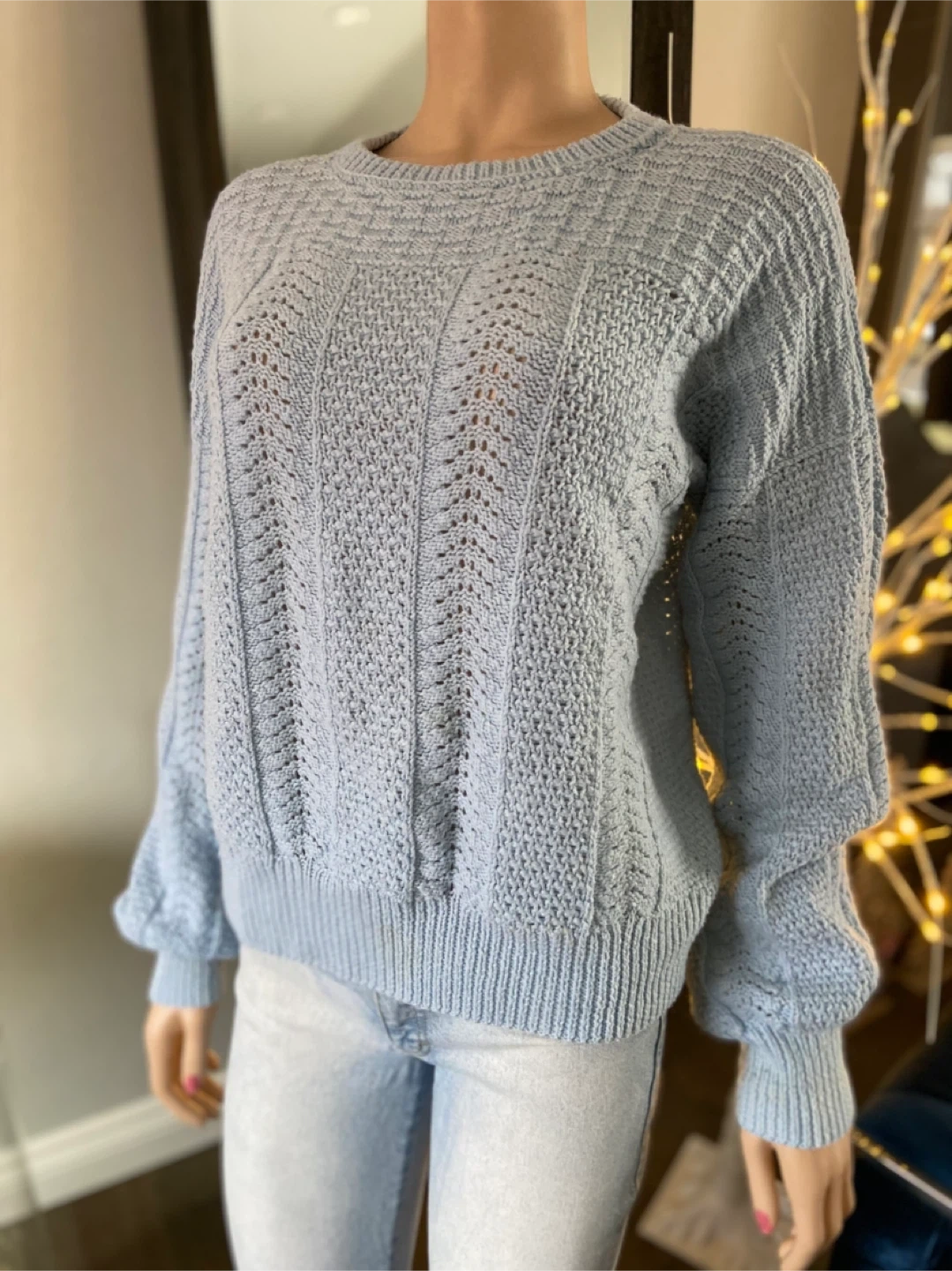 A cozy light blue hand-knitted pullover sweater with a delicate textured pattern. It features a classic crew neckline and long sleeves with cuffed wrists. This sweater's relaxed fit makes it a comfortable layering piece.
