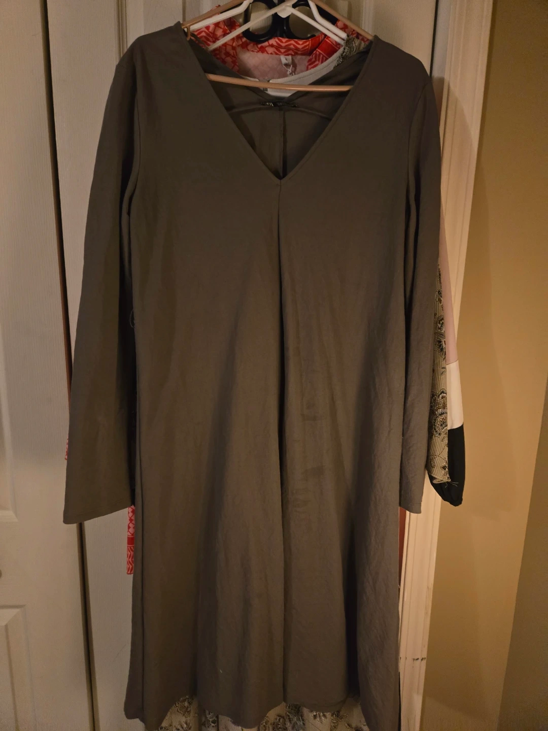 Bundle of four women's long sleeve maxi dresses in various styles and colours. Includes a beige floral print, a colour-blocked beige and black dress, a solid olive green dress, and a bright red patterned dress. They're great for casual wear or layering.