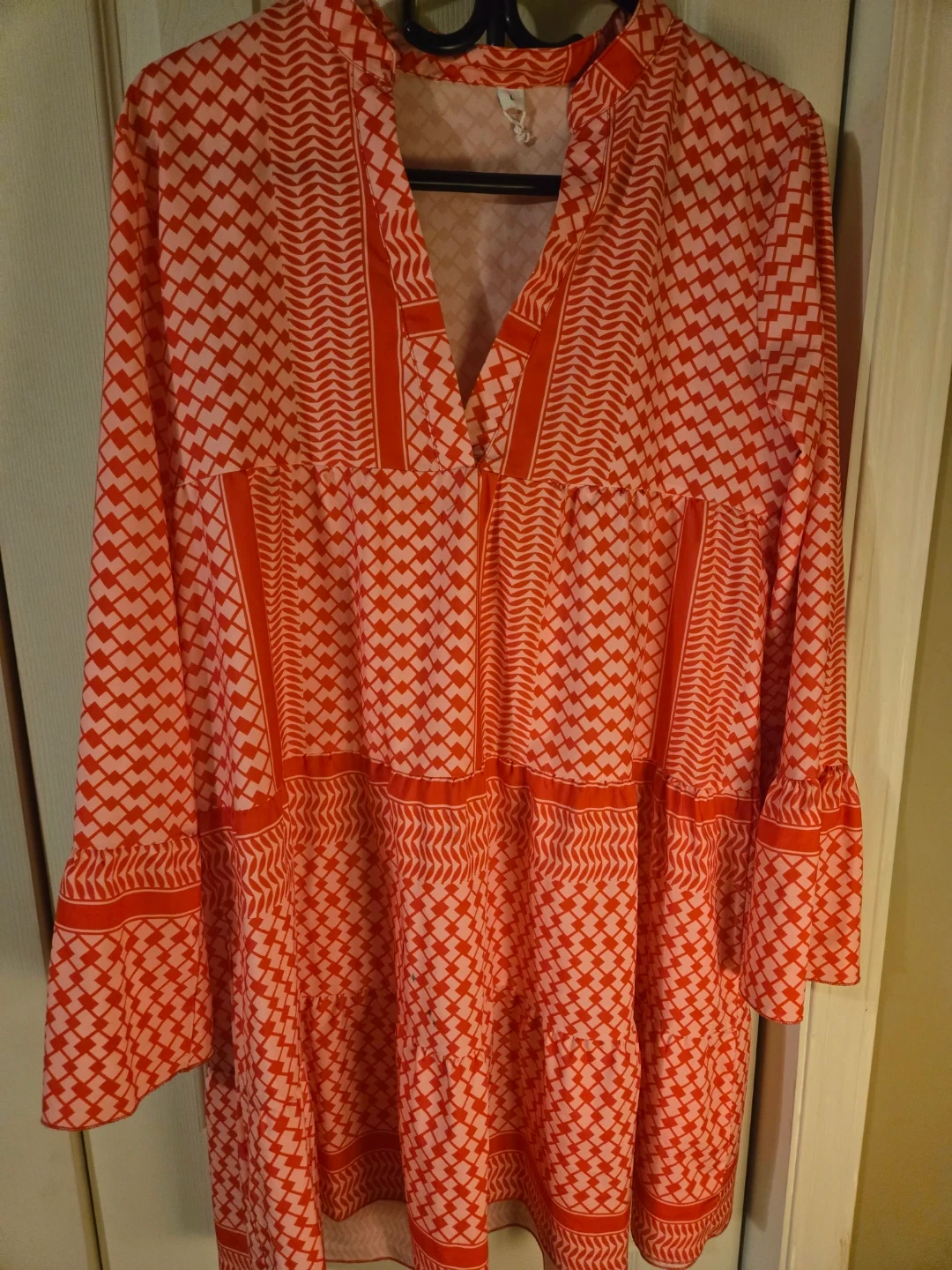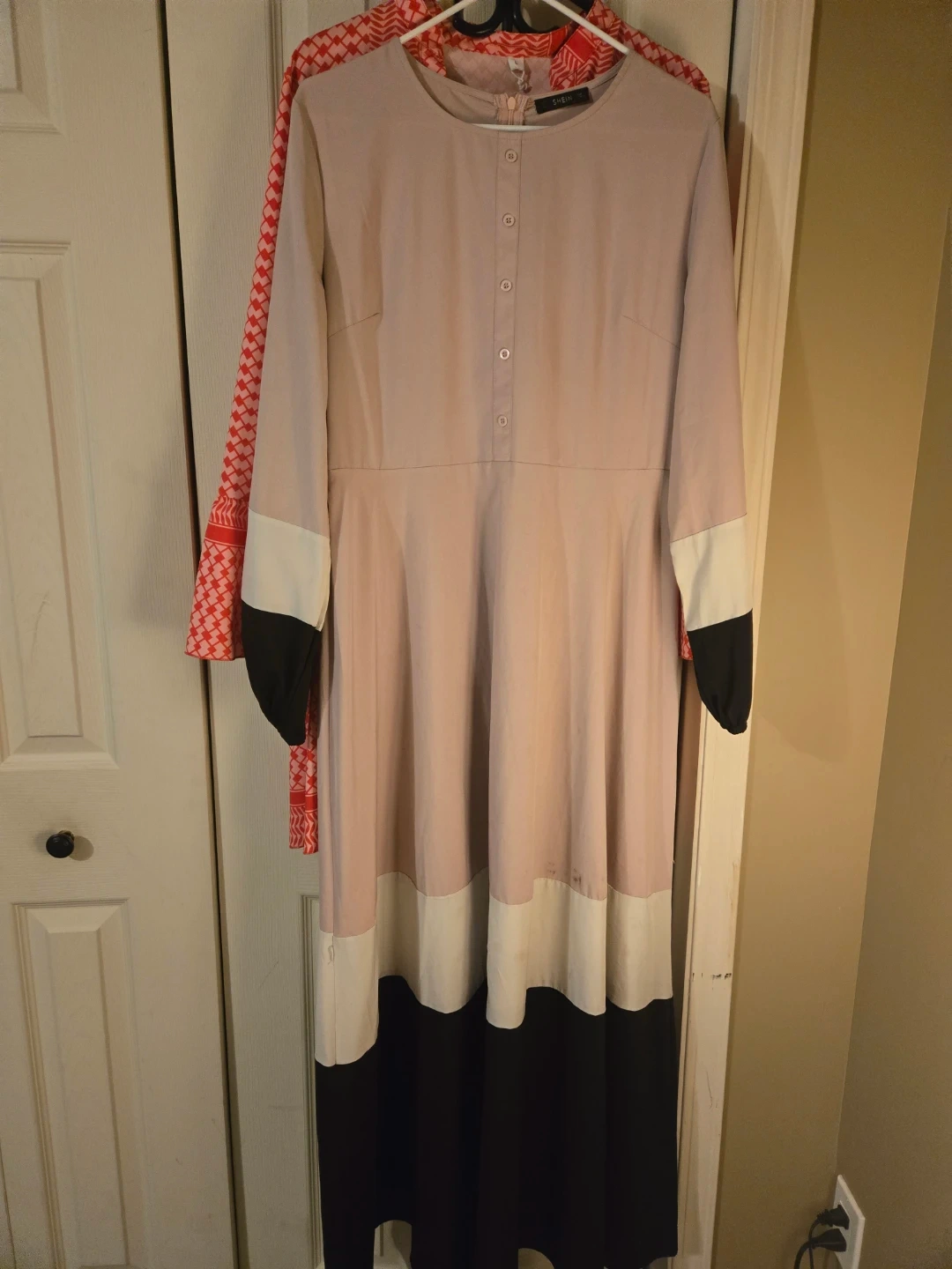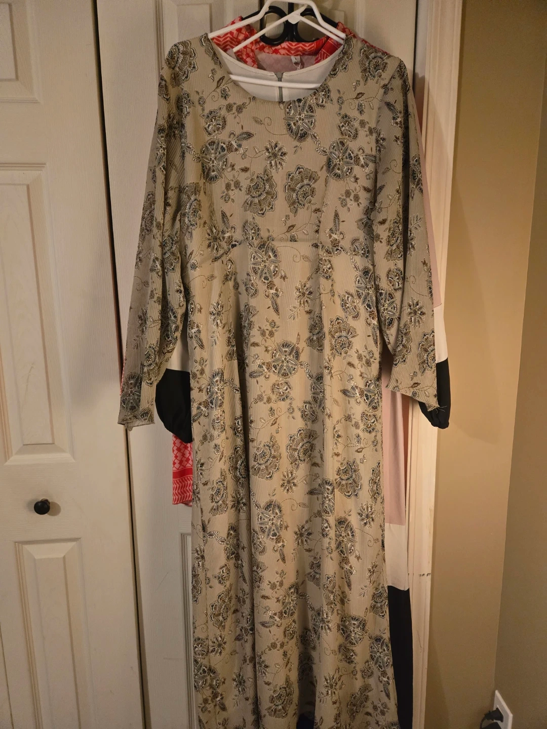 Bundle of four women's long sleeve maxi dresses in various styles and colours. Includes a beige floral print, a colour-blocked beige and black dress, a solid olive green dress, and a bright red patterned dress. They're great for casual wear or layering.
