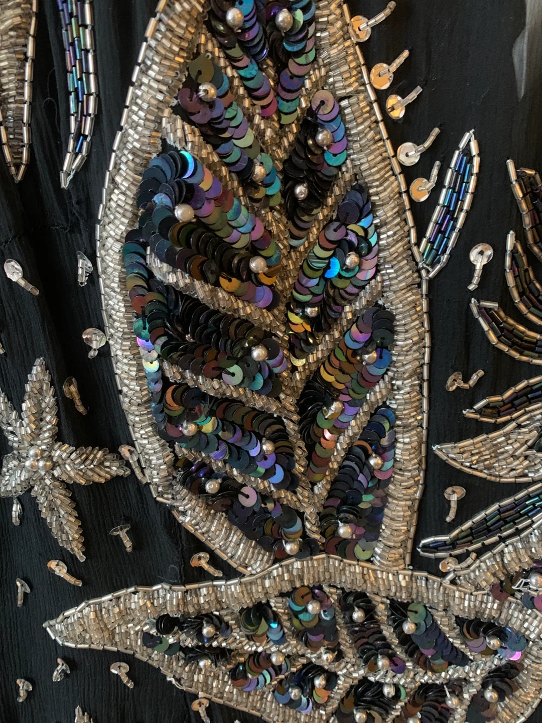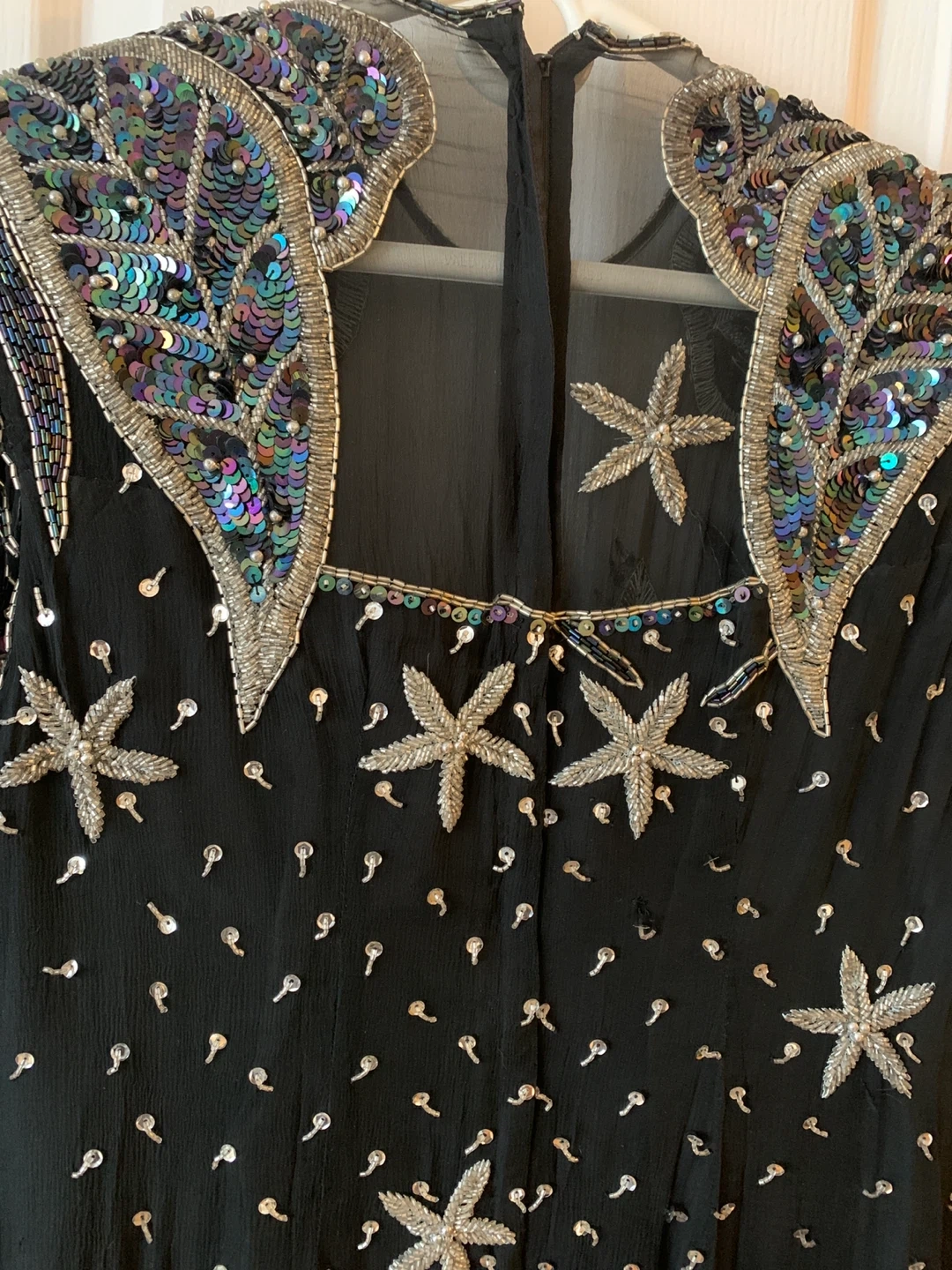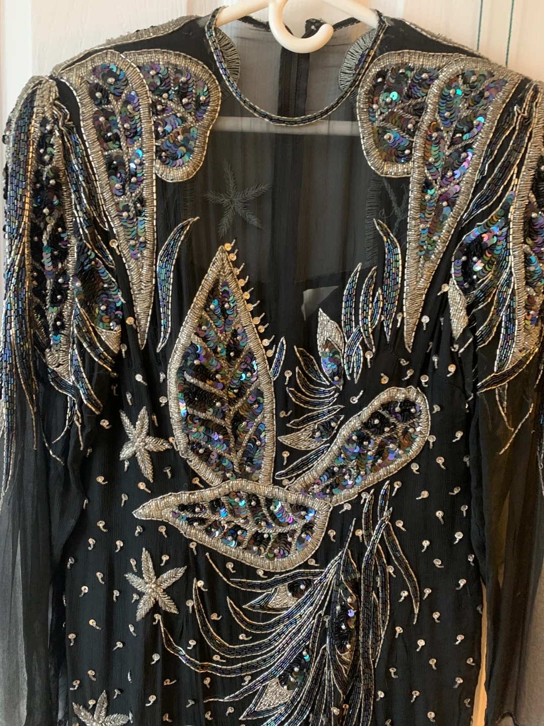 This is a stunning black dress covered in intricate beadwork and sequins. It features a unique design with floral and leaf motifs throughout. The dress has long sleeves and a flattering silhouette.