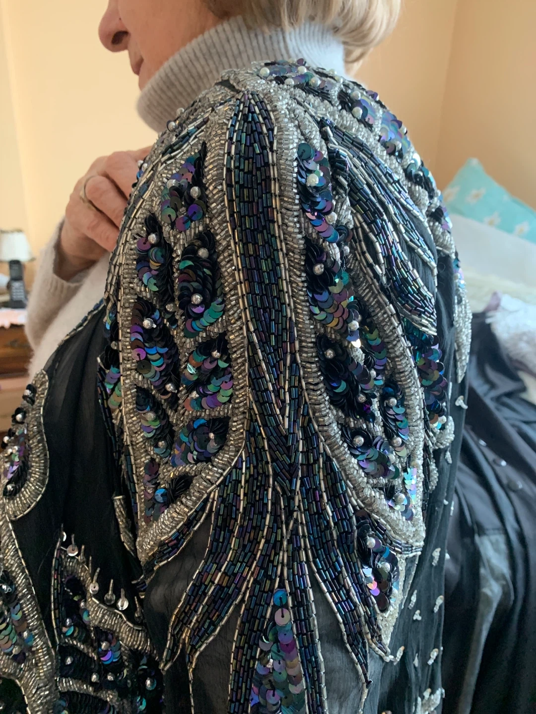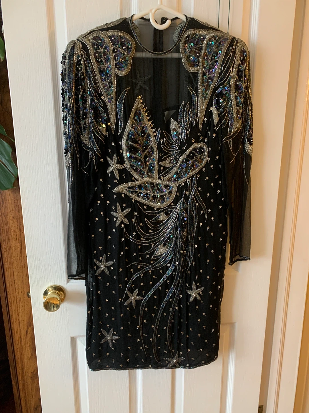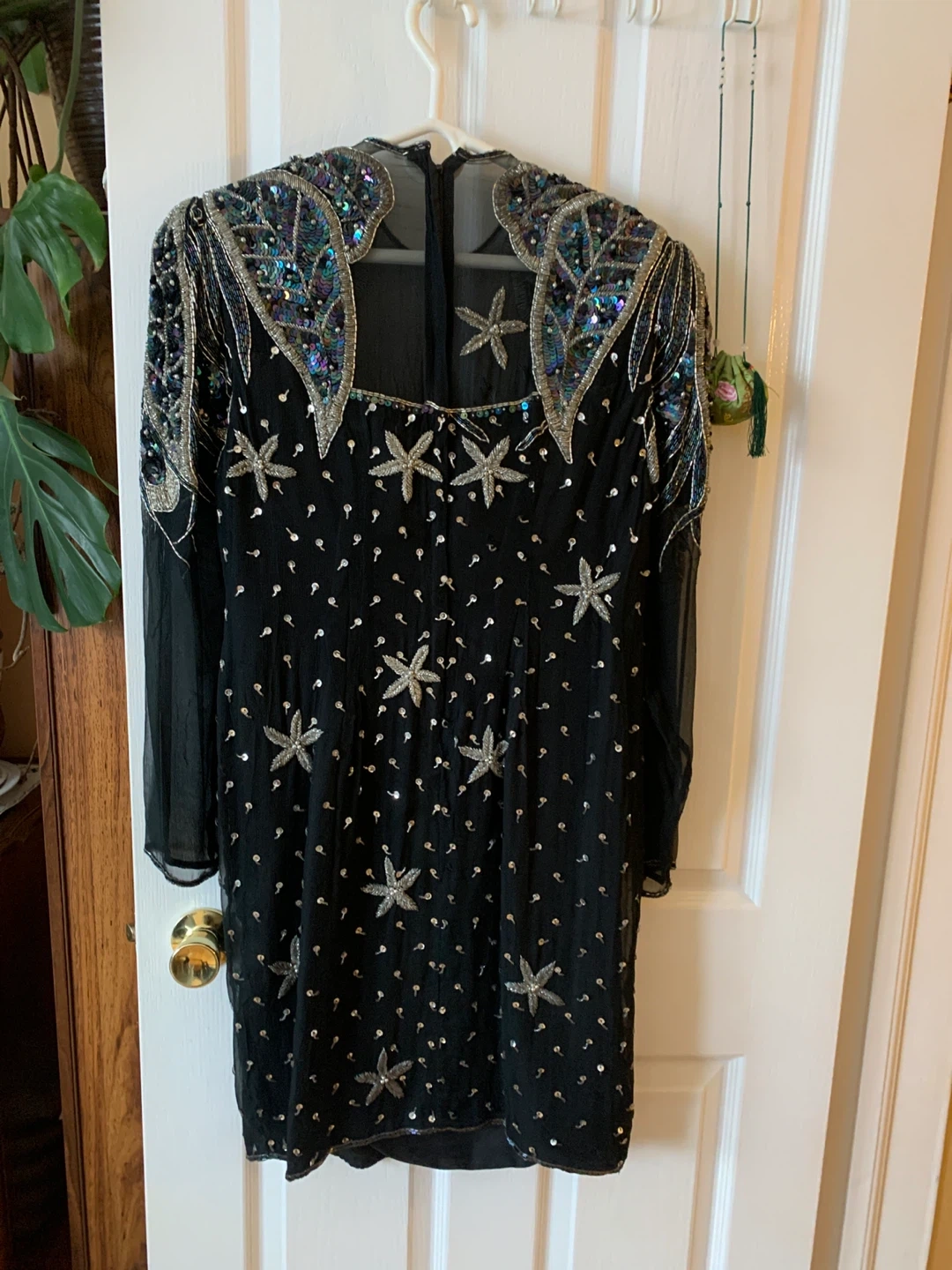 This is a stunning black dress covered in intricate beadwork and sequins. It features a unique design with floral and leaf motifs throughout. The dress has long sleeves and a flattering silhouette.