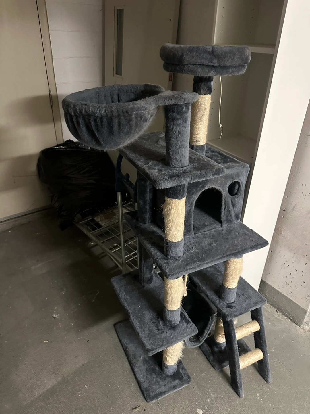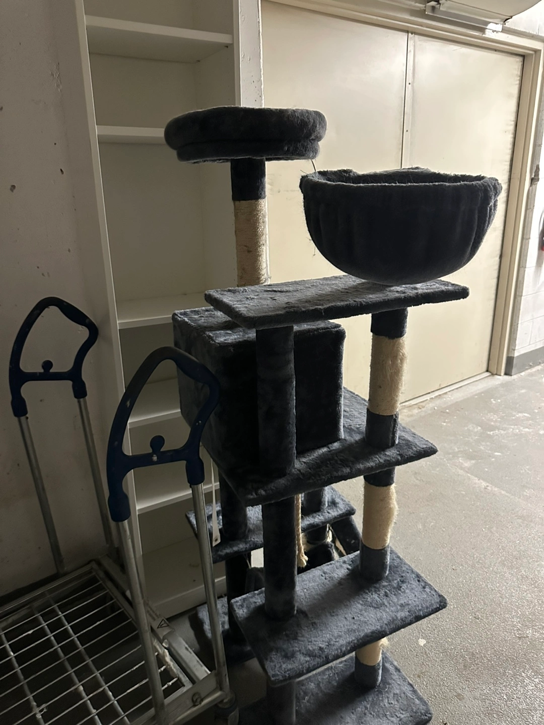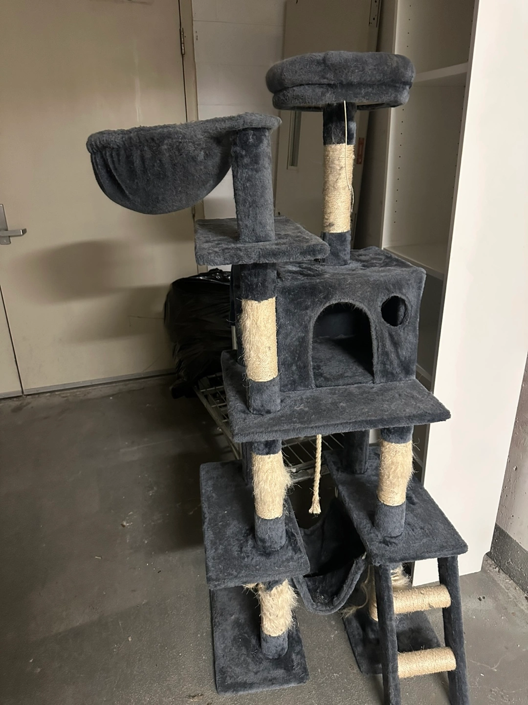Large cat tree, grey fabric, multiple platforms and scratching posts. Features a condo, hanging bed, and a top perch. Good for active cats.