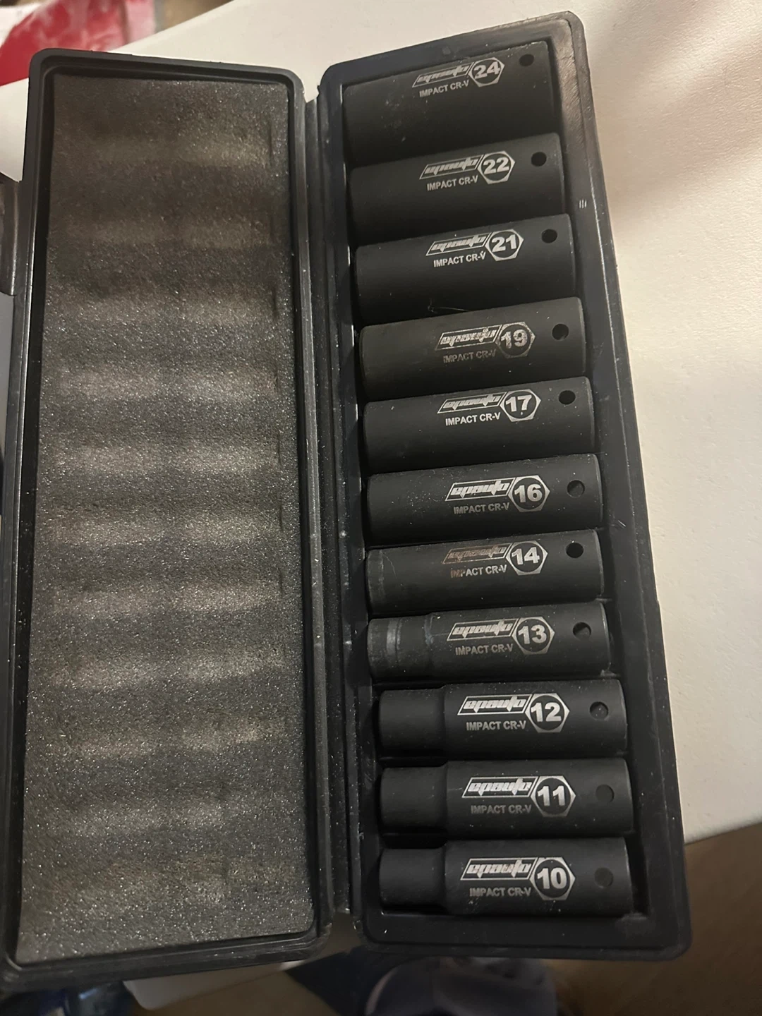 impact socket set includes sizes 10mm through 24mm. Made from CR-V steel for durability. Comes in a plastic case for storage.