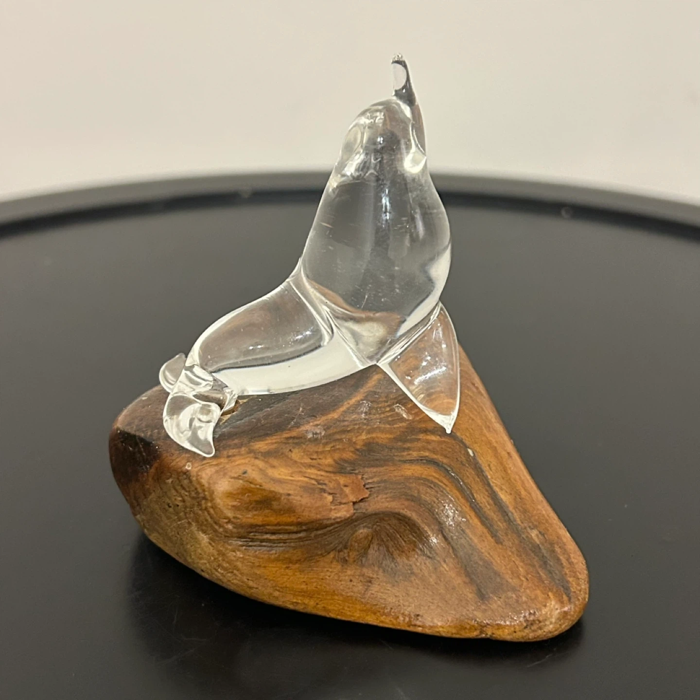 Vintage Hand-Blown Art Glass Seal on Natural Wood Base π