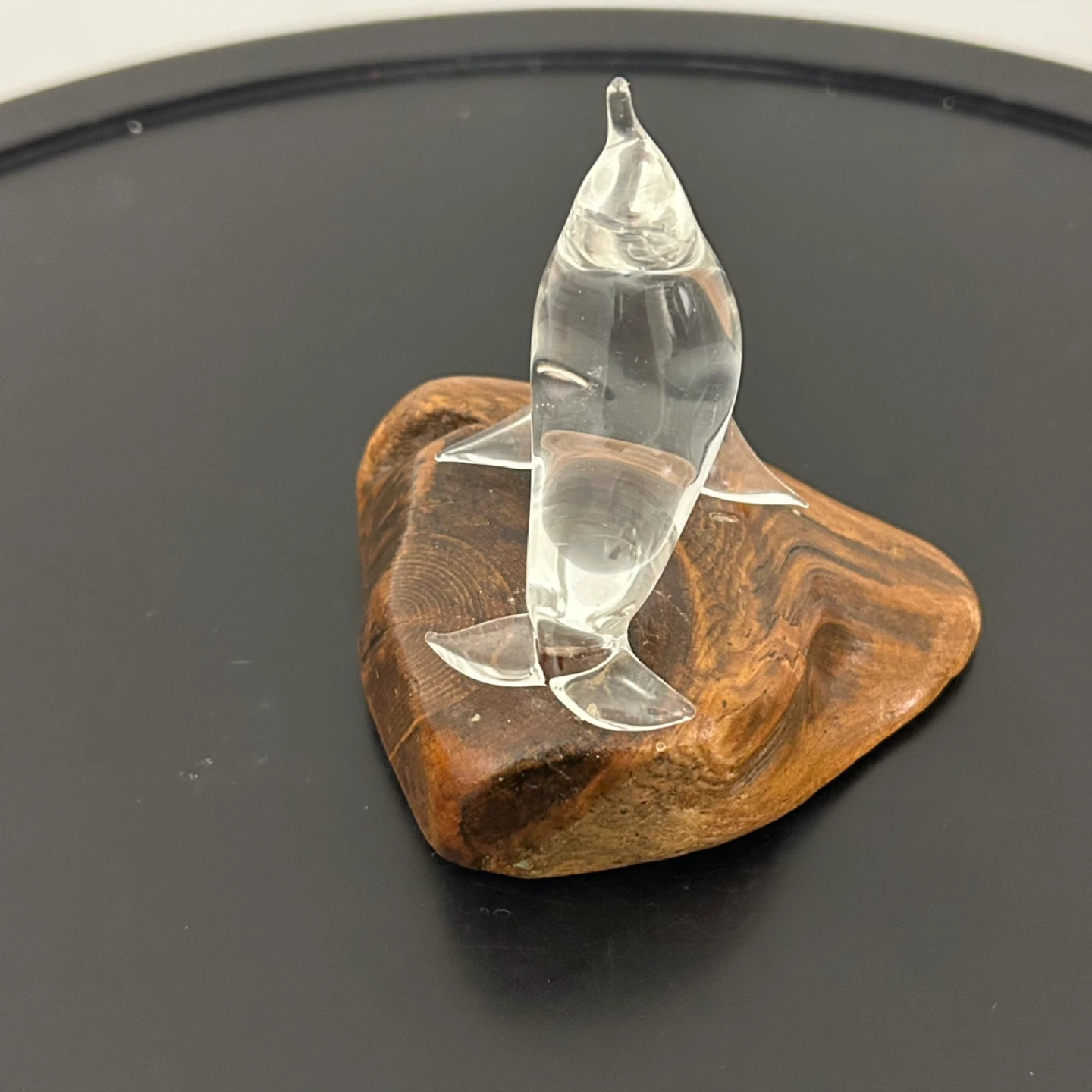 Bring a touch of coastal elegance to your home with this unique hand-blown glass seal. The crystal-clear glass sculpture is gracefully arched and mounted on a beautifully textured natural wood base, reminiscent of driftwood.