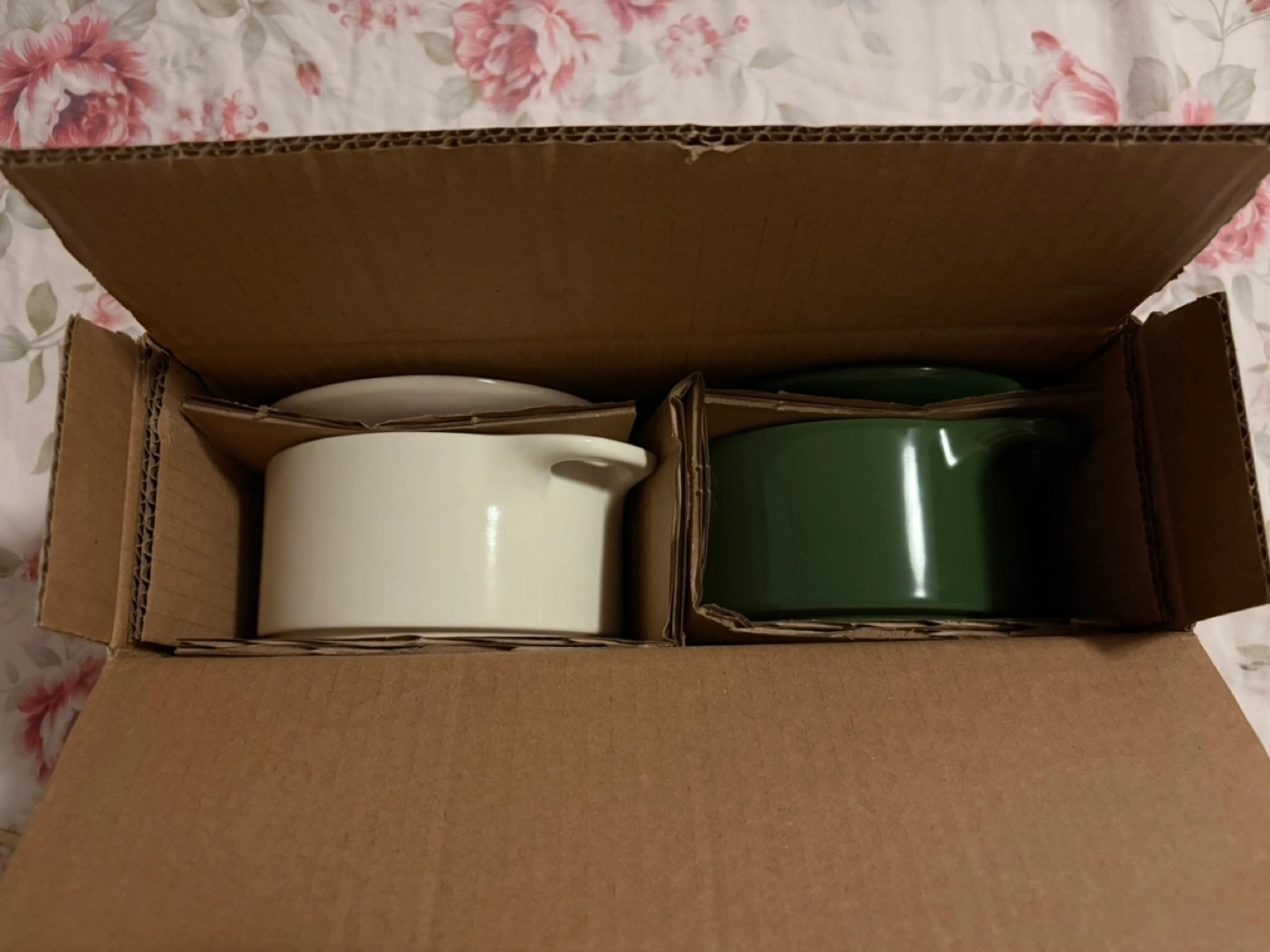 Set of two mini cocottes. Includes two ceramic pots and lids. Great for individual servings or side dishes. Each pot holds 18 oz (550ml).
