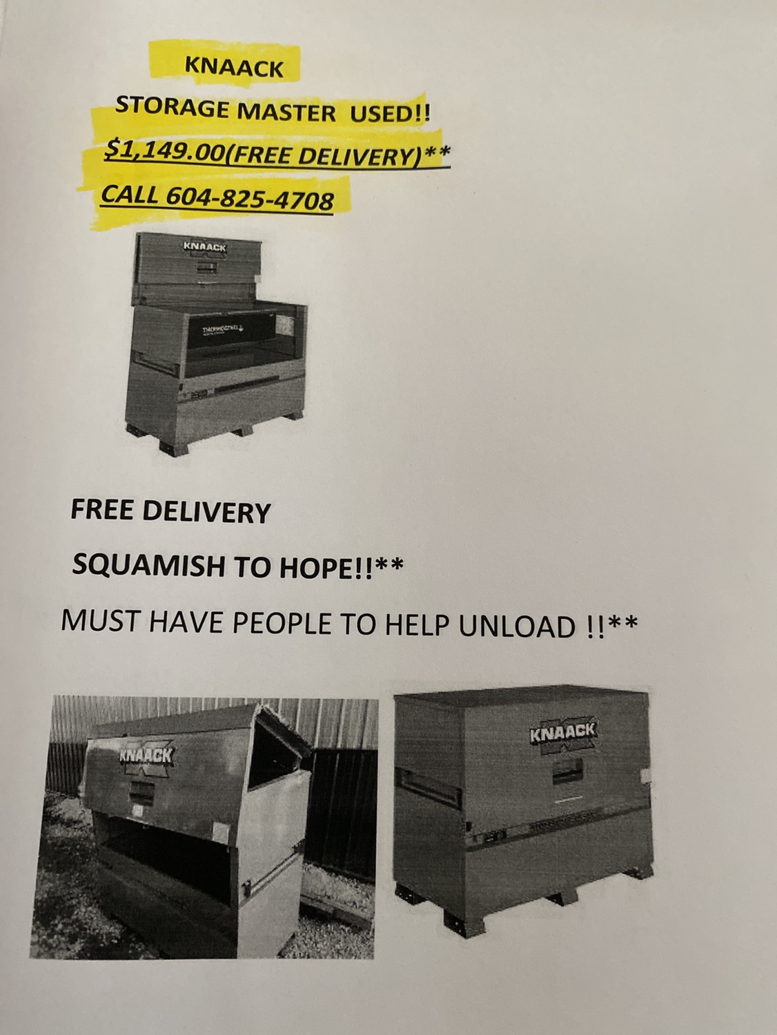 80Knaack 89 Jobsite box USED Storage Master Chest has been surface cleaned!! 60 x 30 x 49 80” tall when opened *FREE DELIVERY* 350 lbs. *Squamish to Hope* someone must be there to help unload