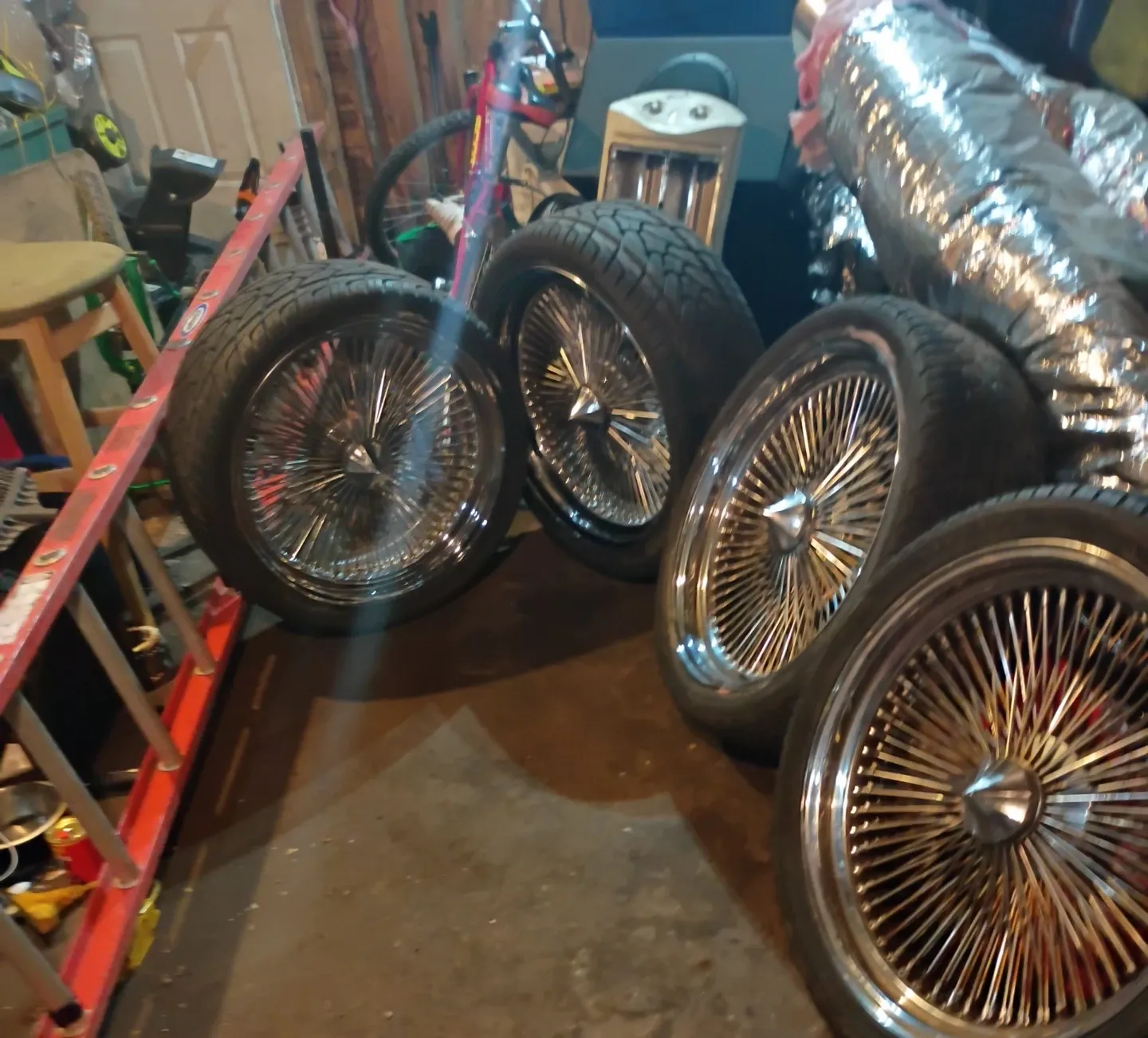 These are a set of four chrome wire wheels, each with a tire mounted. They feature a classic spoked design and a shiny chrome finish. These wheels are designed to give a vehicle a distinctive look.