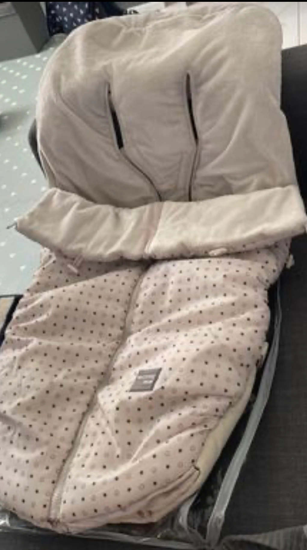 A universal footmuff for toddlers from Pasito a Pasito. The front can be fully detachable and has removable padding. It can be used as a footmuff or stroller liner. The back hooks over the stroller and has adjustable velcro openings and elastic velcro straps to keep it in place.