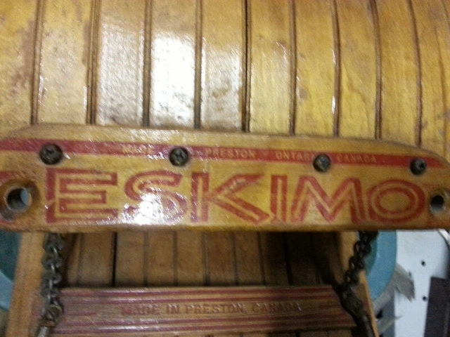 Up for sale is a very nice and rare antique Eskimo bent wood 'Lund' child toboggan with a very strong and nice label, in a dark and blond wood color! The toboggan measures 37 inches long by 12 inches wide and is in great condition with light normal wear. Check the photos and notice how the toboggan is made with great style! A beautiful Lund toboggan that is in nice condition! All original and in great condition. Ready to use or to hang as a decoration, or would be a great piece in the man cave or a nice Christmas gift for any collector. Truly a great vintage wooden toboggan with a great patina finish! Made By Eskimo Preston On Canada. A very rare piece. Asking $425.00 if interested please contact Michel at 613-709-3013 thank you