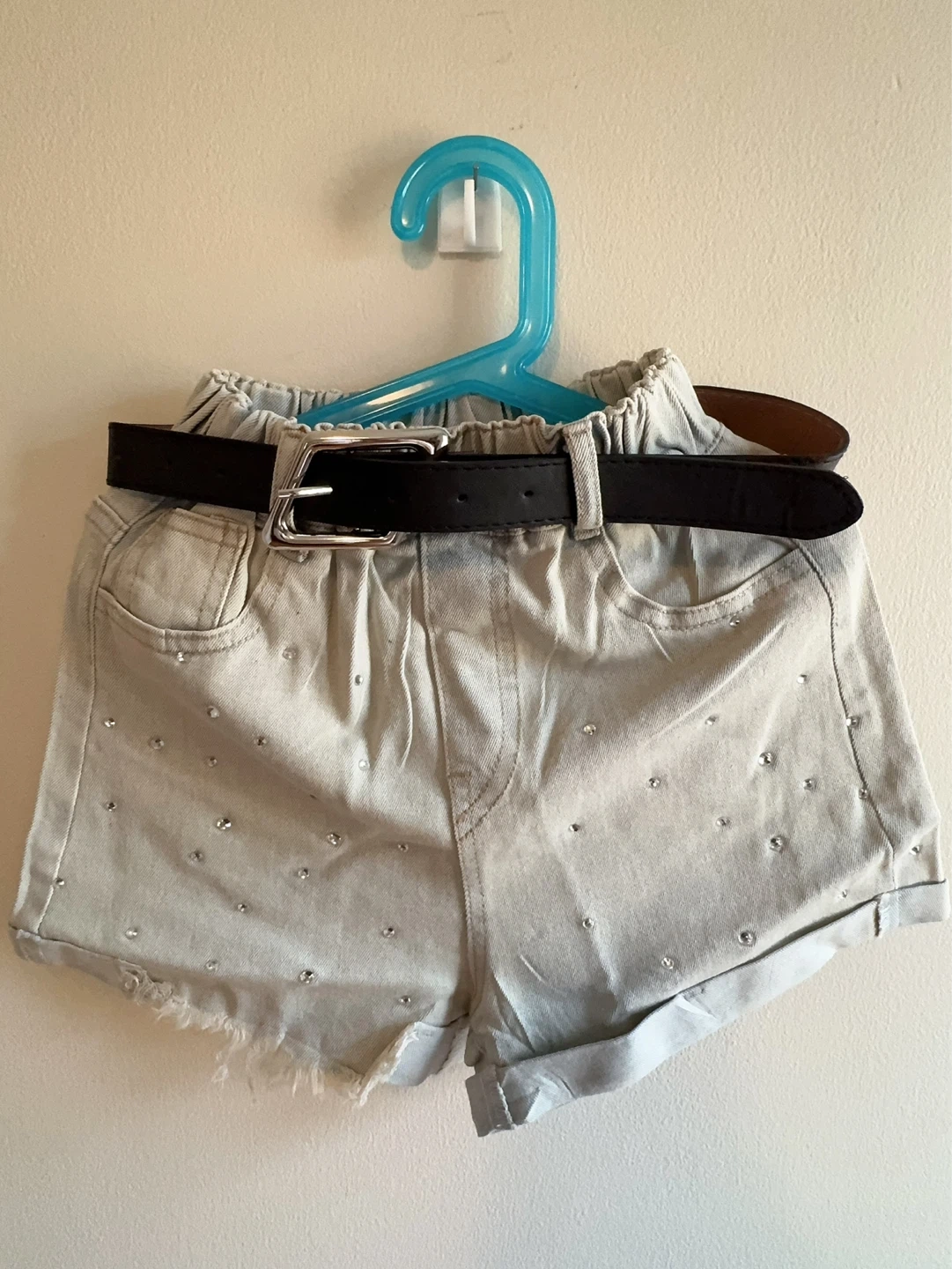 Light wash cotton denim shorts, embellished with scattered rhinestones. Elastic waistband and includes a black belt.