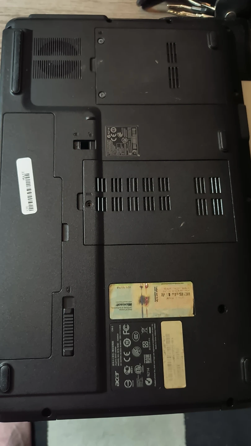 This is an Acer Aspire 5 laptop. It's a dark blue color and features a standard QWERTY keyboard layout. The bottom shows ventilation grilles and various labels.