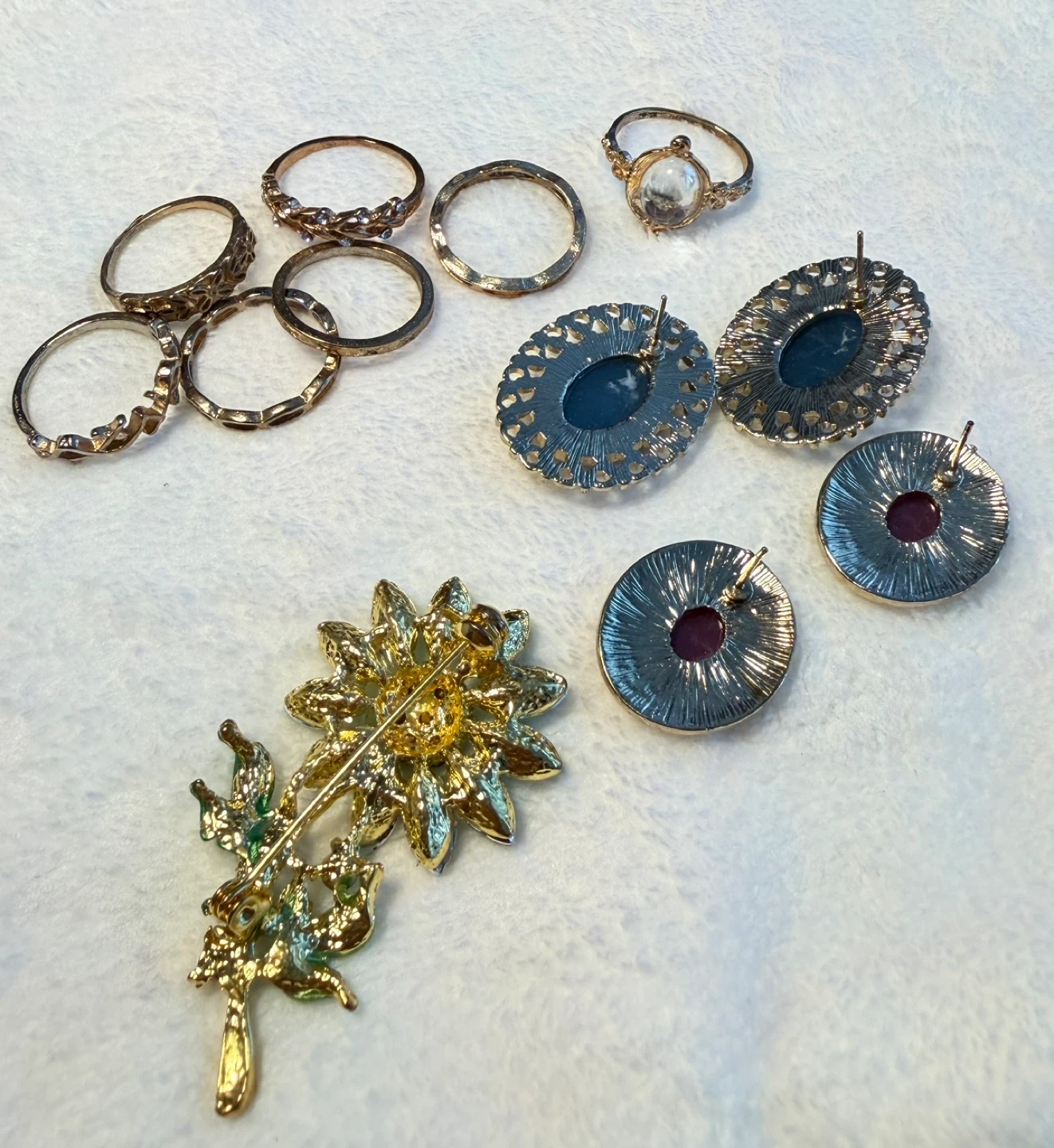 This lot includes a variety of costume jewelry pieces. You'll find several rings, a flower-shaped brooch with green accents, and a set of oval and round earrings. These pieces are great for adding a touch of sparkle to any outfit.