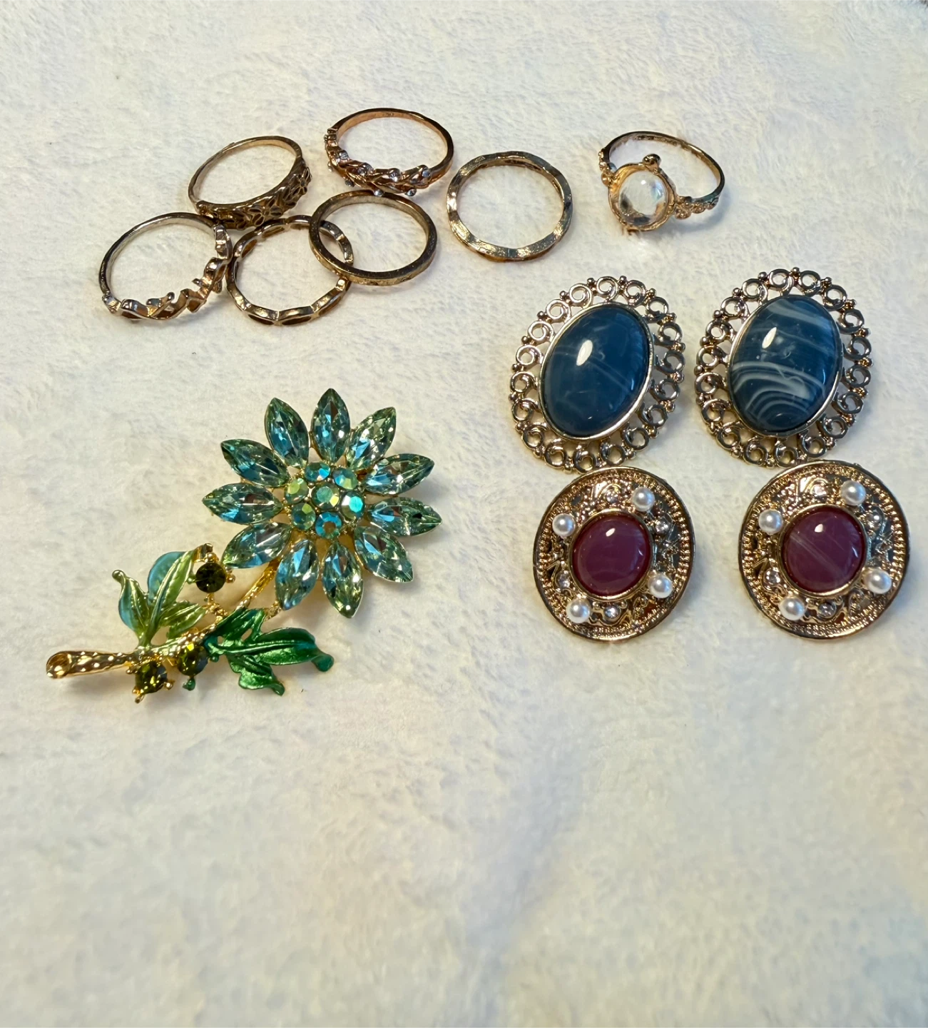 This lot includes a variety of costume jewelry pieces. You'll find several rings, a flower-shaped brooch with green accents, and a set of oval and round earrings. These pieces are great for adding a touch of sparkle to any outfit.