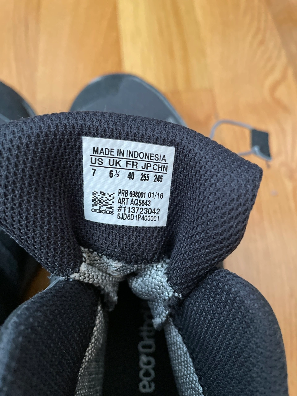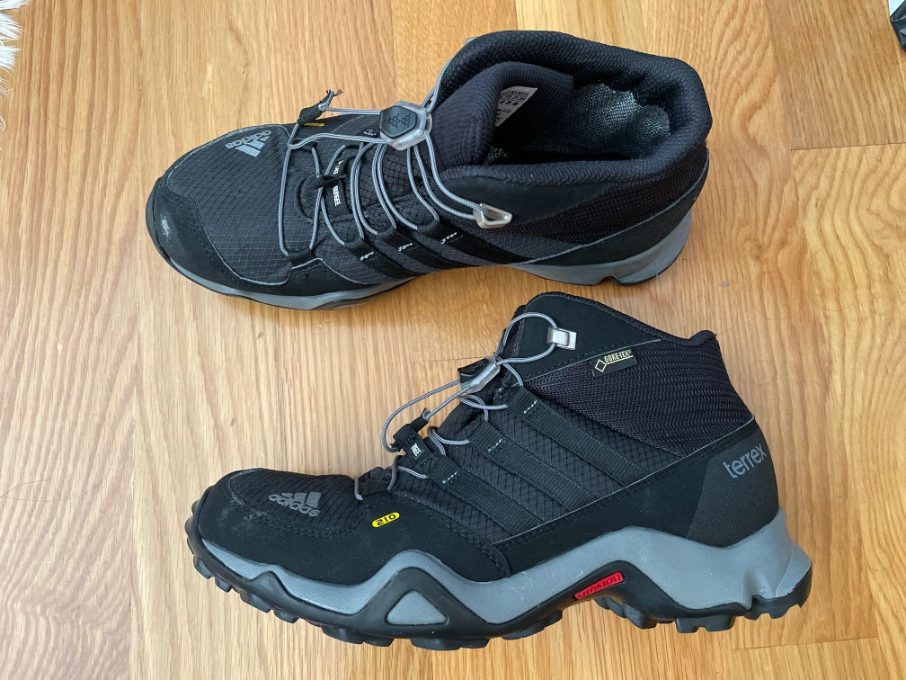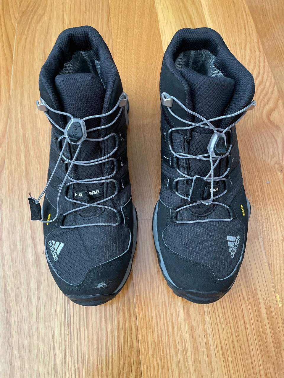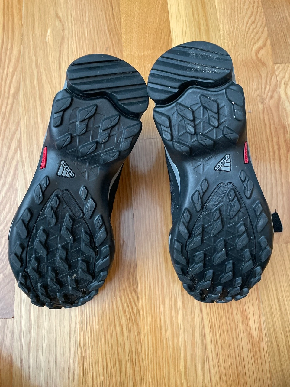 118Adidas Terrex hiking/sneaker shoe with a drawstring bungee like tying system. Used maybe once. See picture of the sole. Scuff on the right front toe. Otherwise like new shoes. They are black and gray. Size 7.