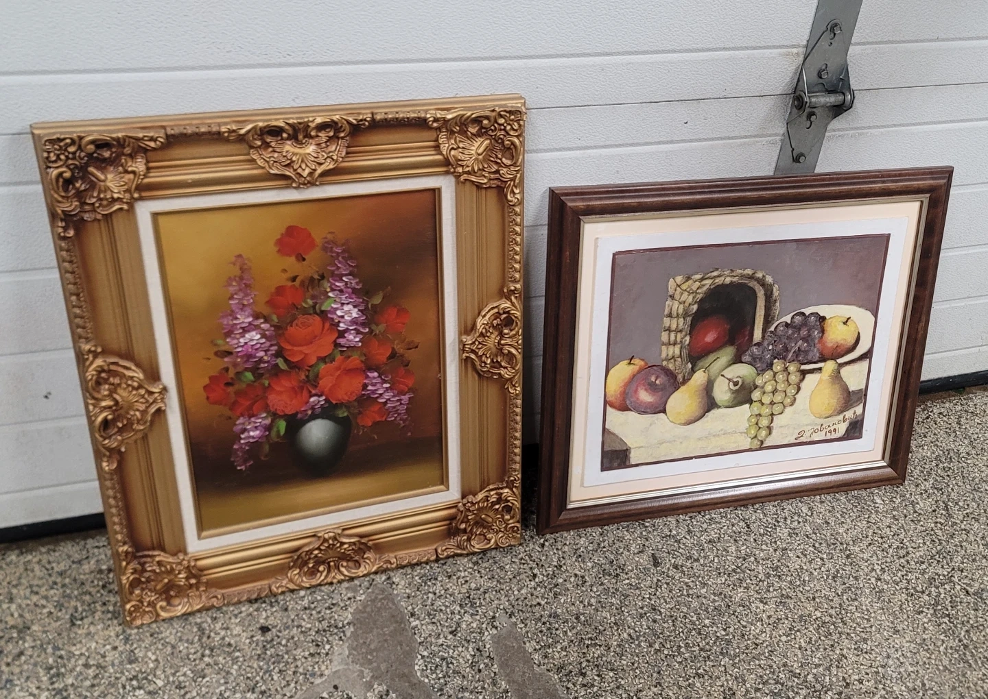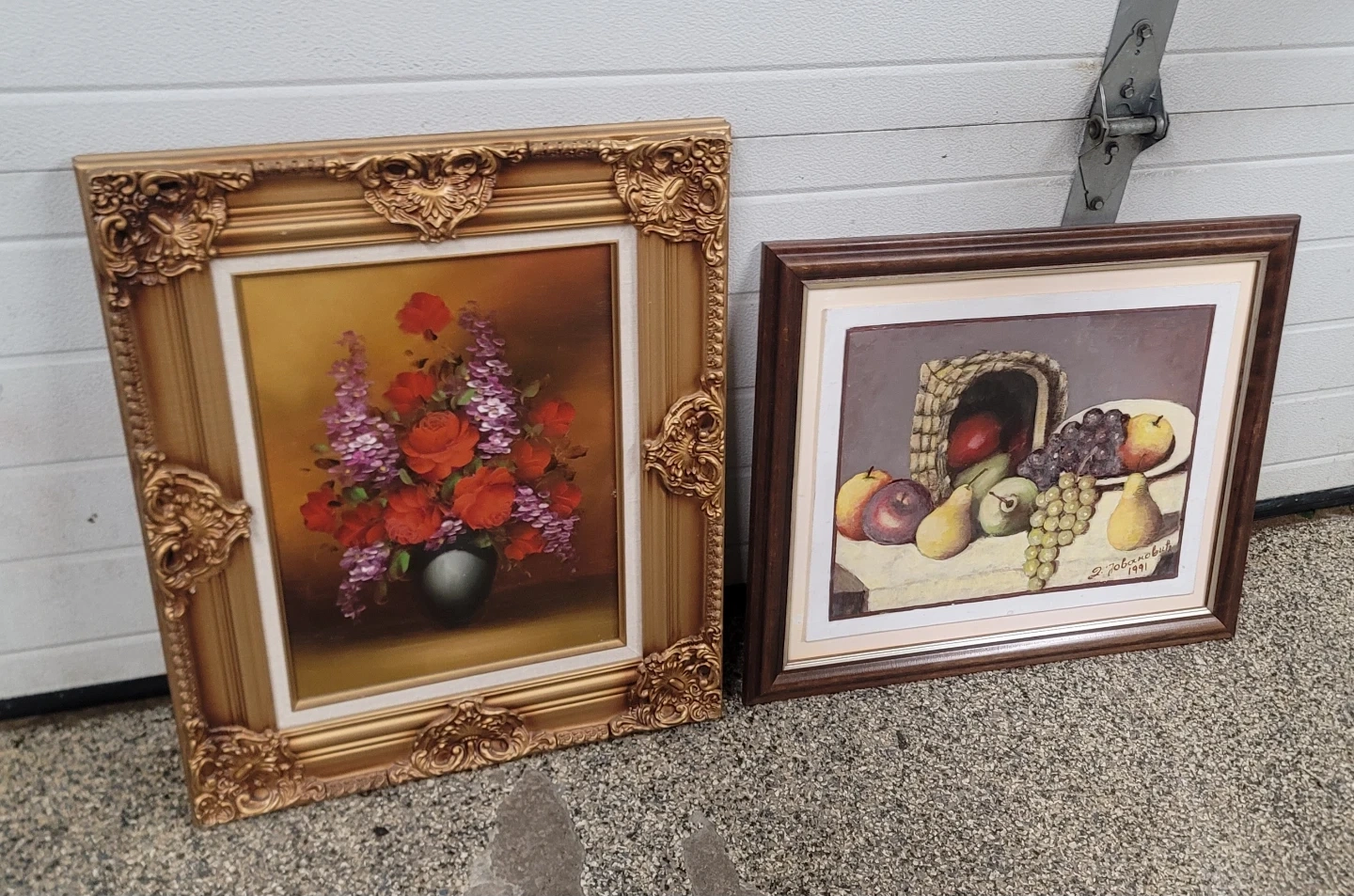 Selling two framed paintings. One features a vibrant floral arrangement with red roses and purple flowers. The other is a still life with fruit in a basket. Both are ready to hang!