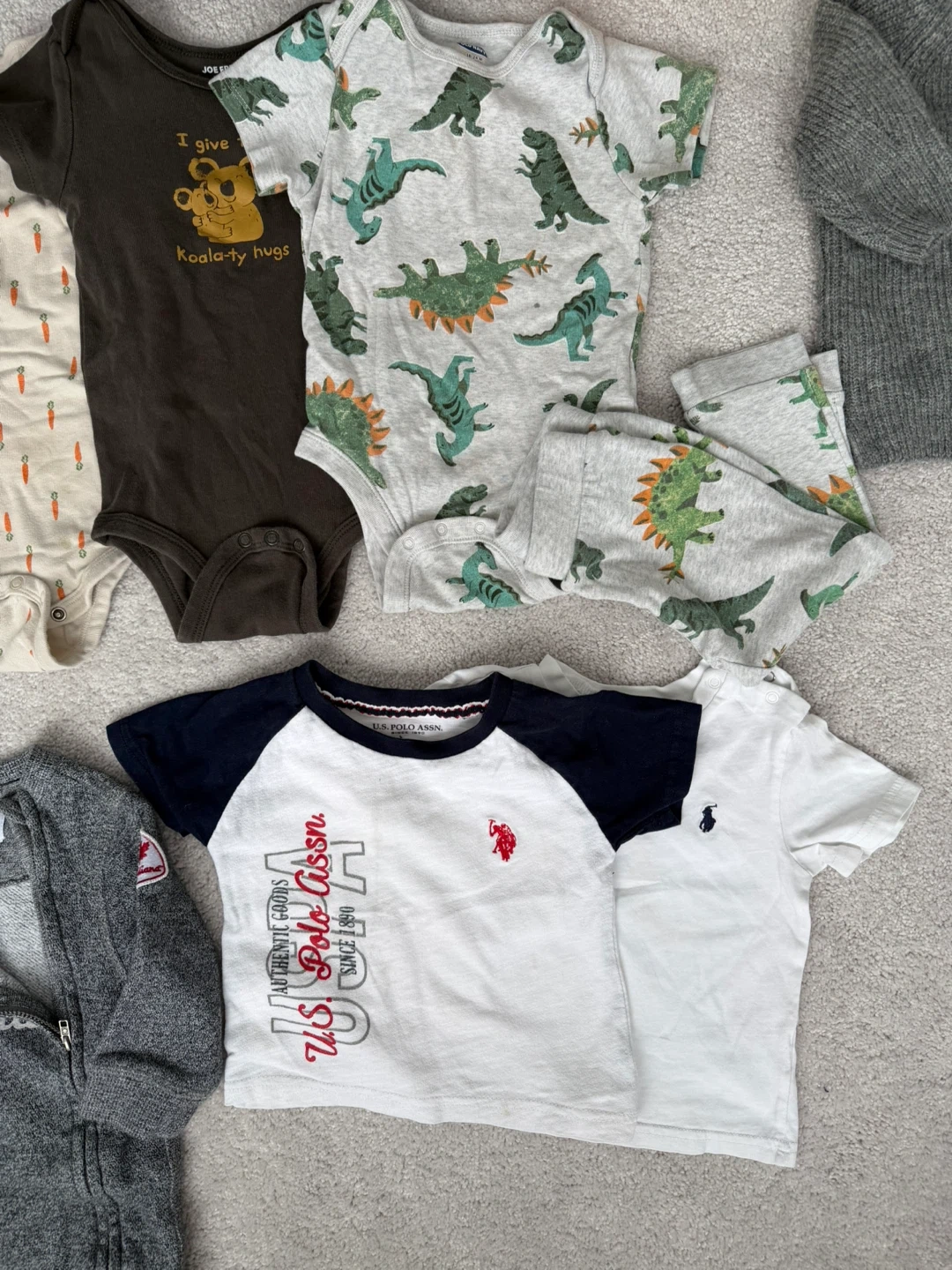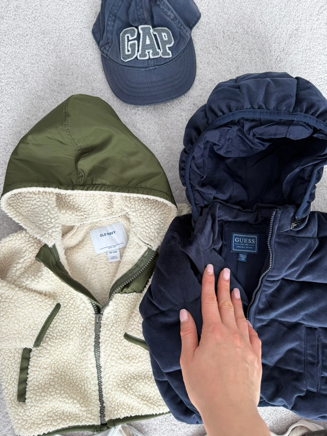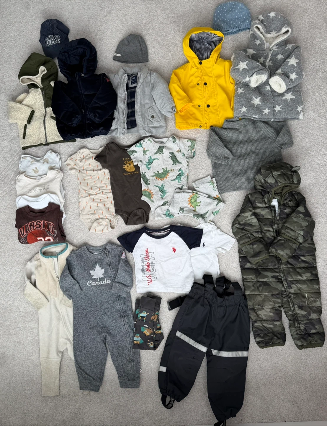 A collection of baby clothes including onesies, sleepers, jackets, and hats from various popular brands. All items are size 12-18 months. Includes a GAP puffer jacket, Joe Fresh rain jacket, Old Navy fleece jacket, and more.