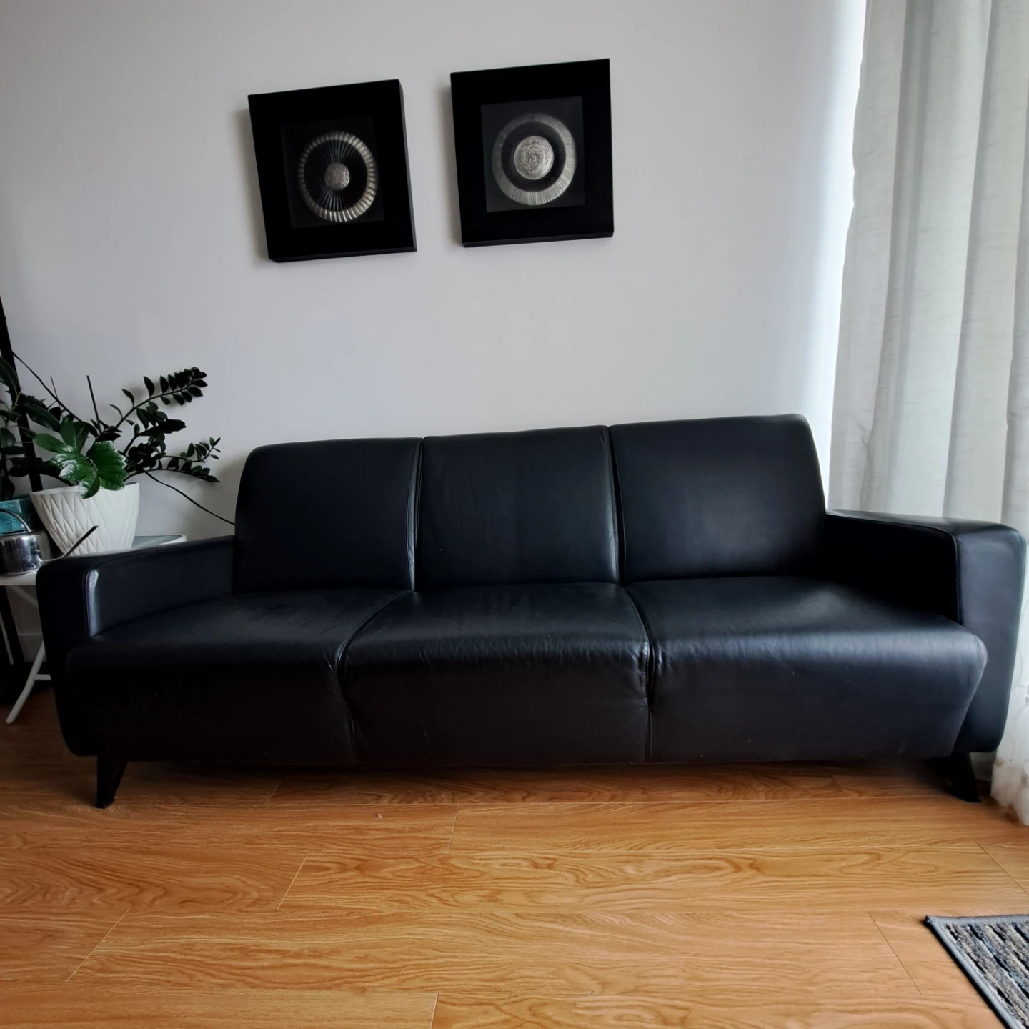 This is a three-seater black leather sofa. It's a sleek addition to any living space. Its classic design fits well with various decor styles.