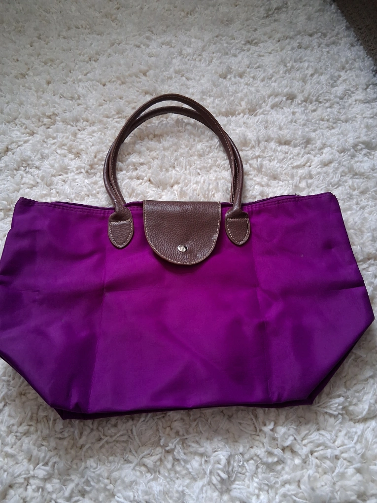 Free a tote bag in a vibrant purple colour! It features brown leather handles and a snap closure. A great condition !