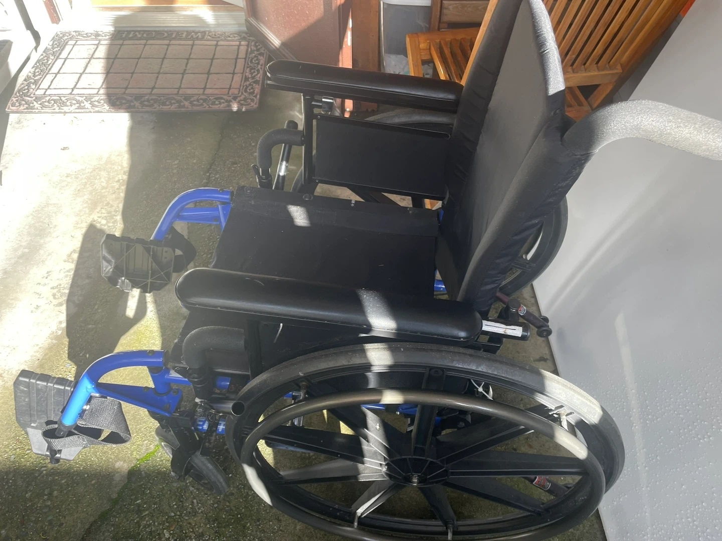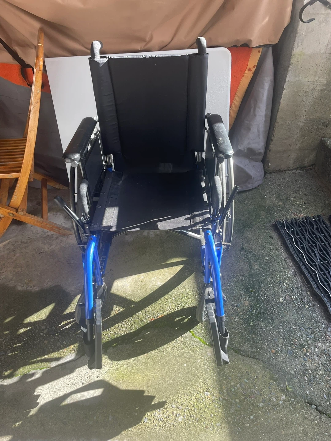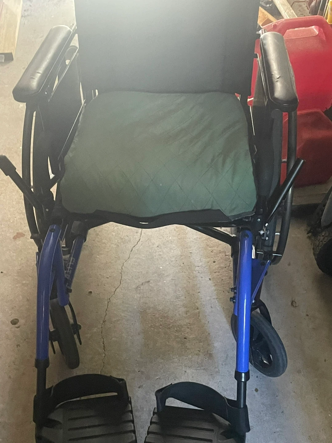 This is an Action brand lightweight wheelchair with a blue frame. It includes a green seat cushion for added comfort. It's great for easy transport and mobility.