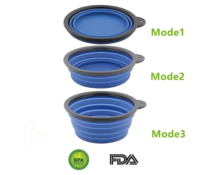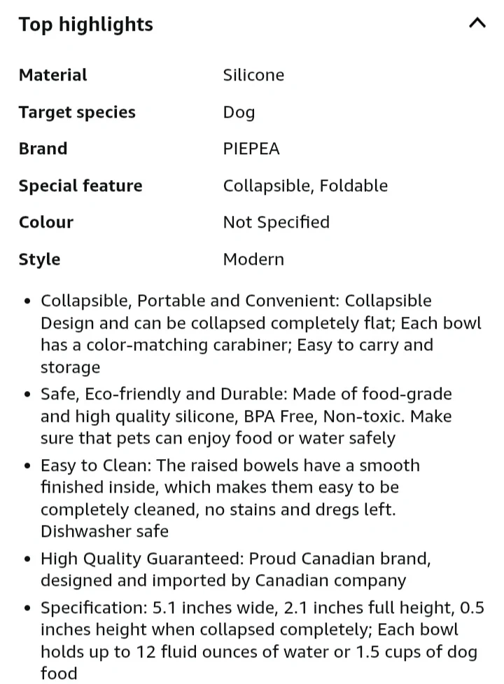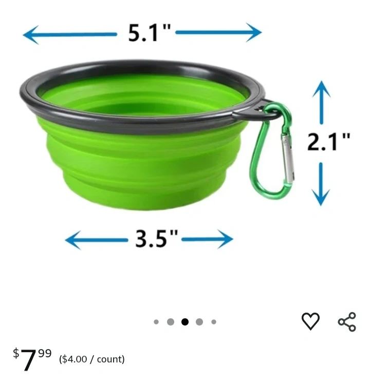 This is a two-pack of Piepea collapsible dog bowls. They're made of food-grade silicone and are BPA-free. Each bowl measures 5.1 inches in diameter when expanded and 2.1 inches in height. This makes them super handy for travel with your furry friend!