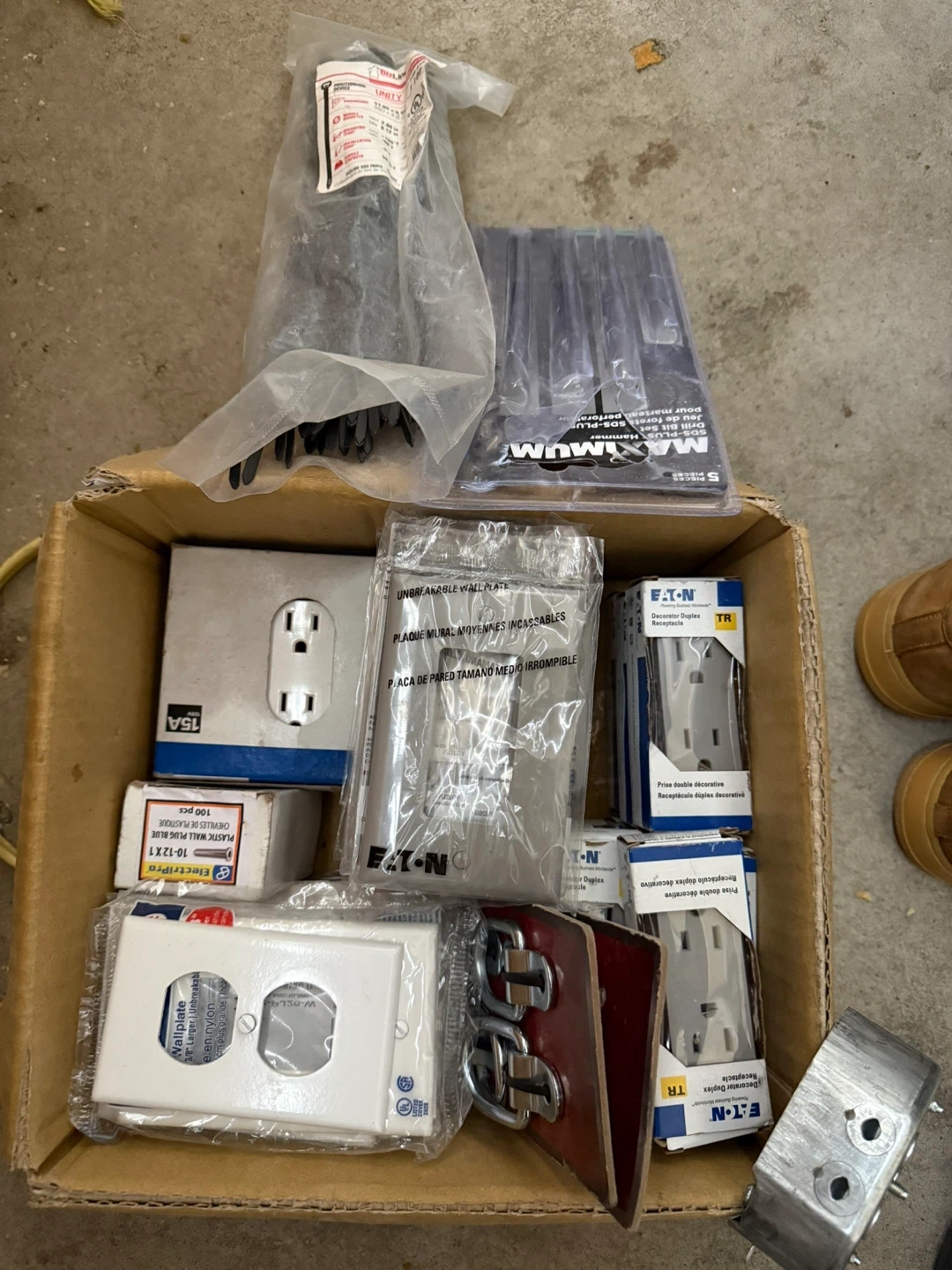 Bundle includes DeWalt power drills and various electrical components like outlets and wall plates. Also contains an assortment of hand tools such as pliers and screwdrivers. This collection is great for DIY projects or professional electrical work.