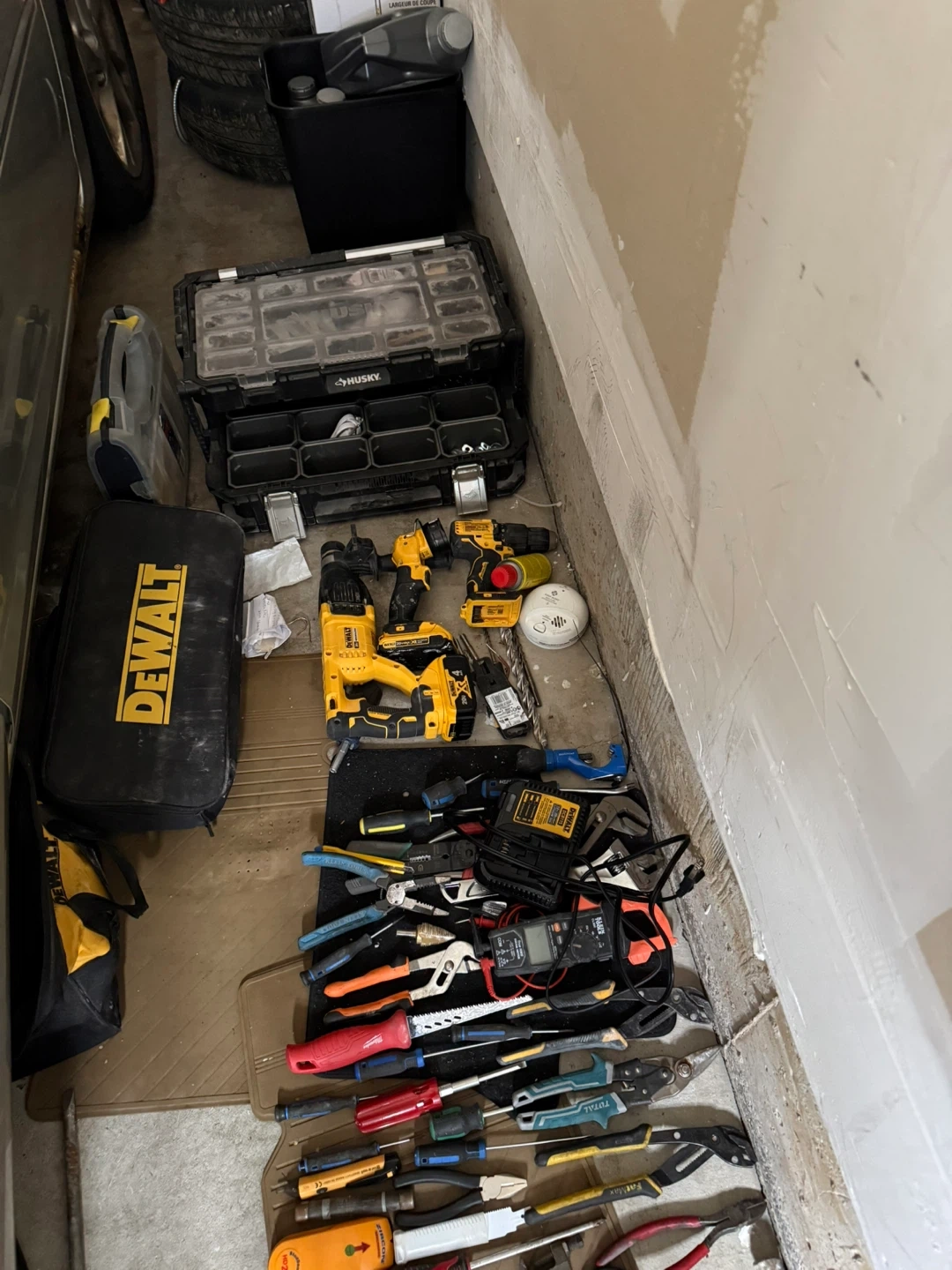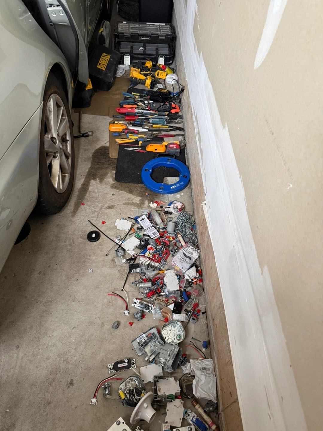 Bundle includes DeWalt power drills and various electrical components like outlets and wall plates. Also contains an assortment of hand tools such as pliers and screwdrivers. This collection is great for DIY projects or professional electrical work.