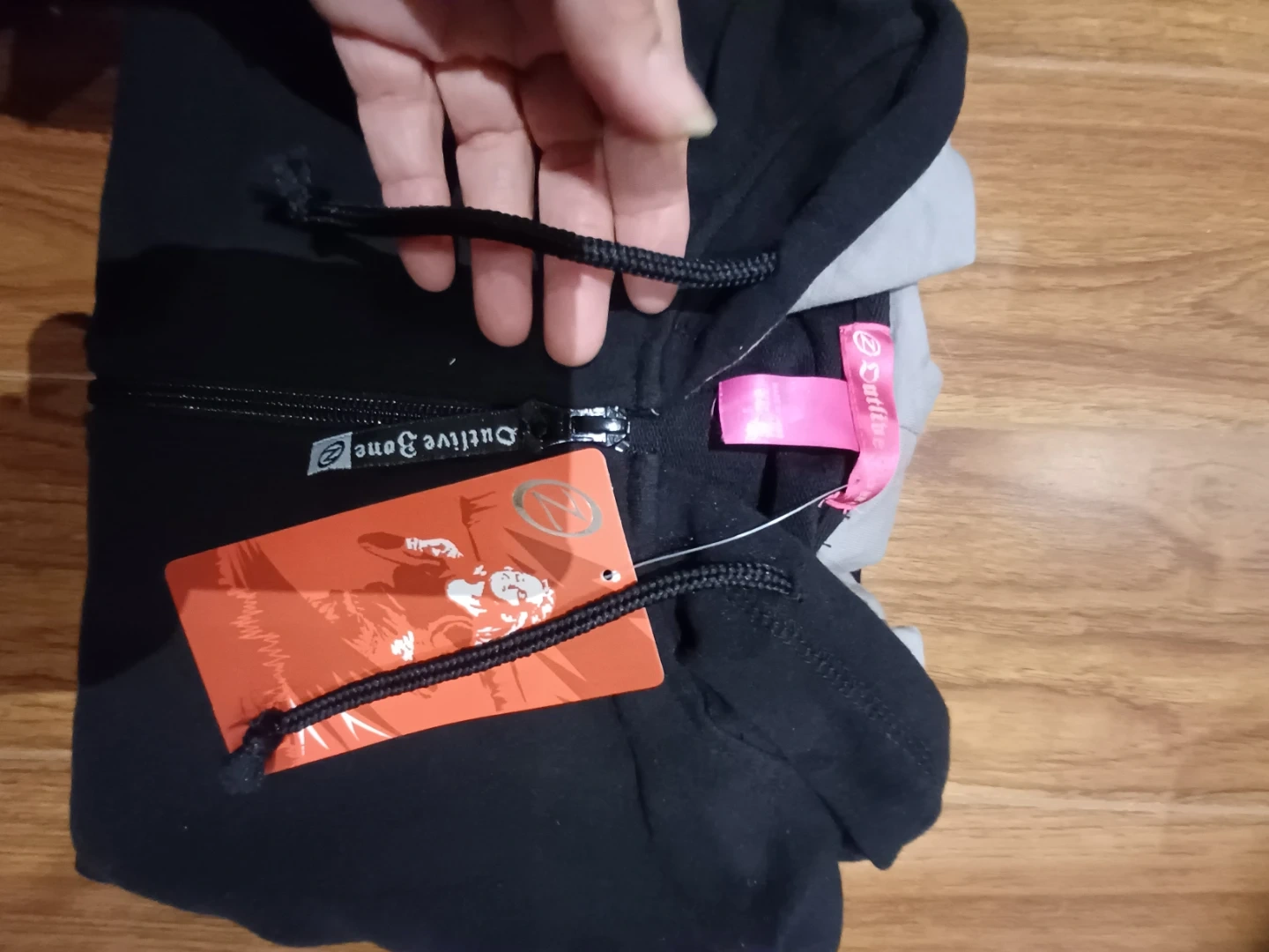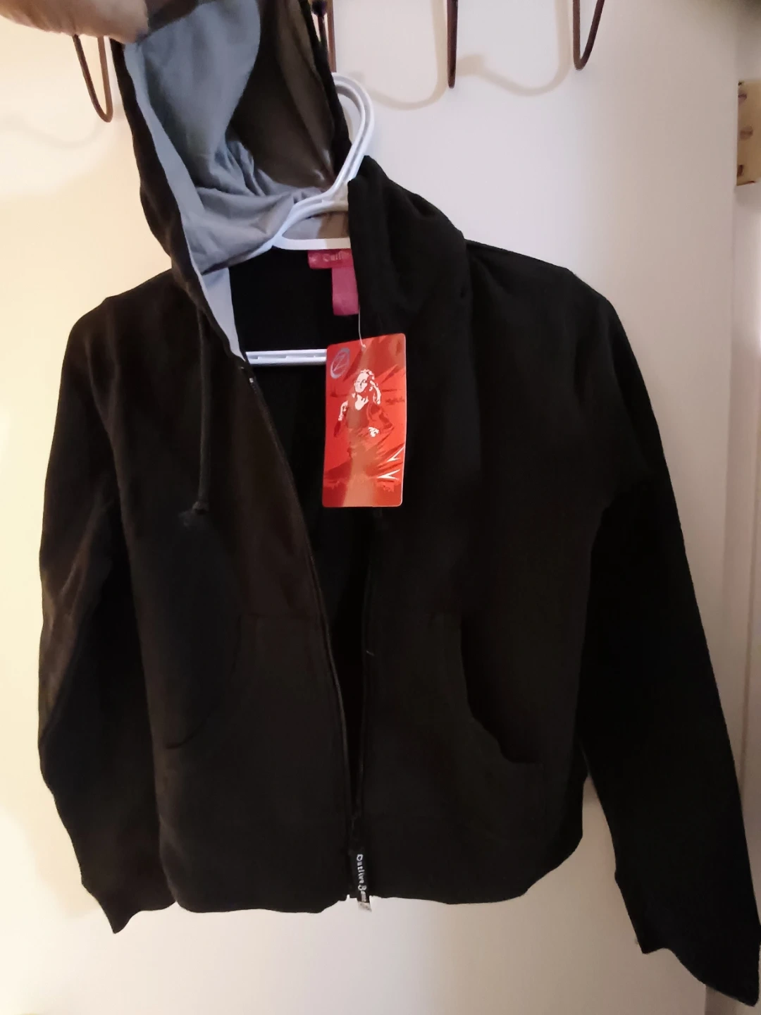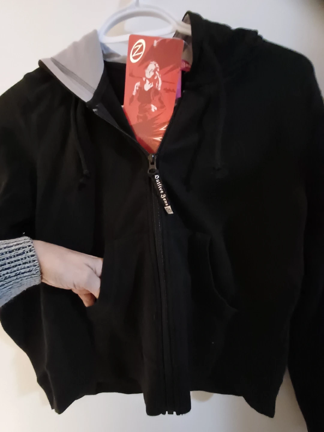 NEW Active Zone black zip-up hoodie with 2 front side pockets, size SMALL. The hood is lined with grey fabric and features a full zipper front.
