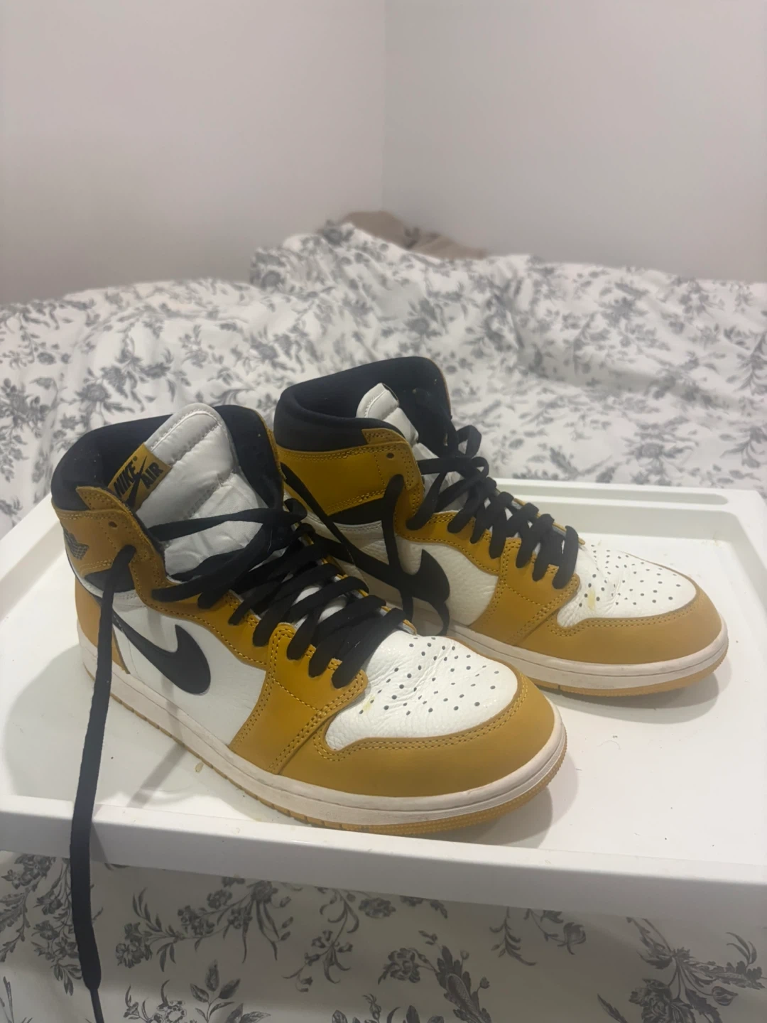 These are Air Jordan 1 High OG sneakers in a "University Gold" and white colourway. Leather and synthetic materials. Includes original laces. Some minor yellowing on the soles.