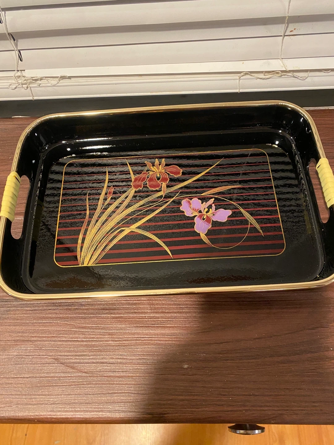 Elevate your serving or display game with the vintage charm of this 3-piece Black Lacquer Iris nesting tray set.