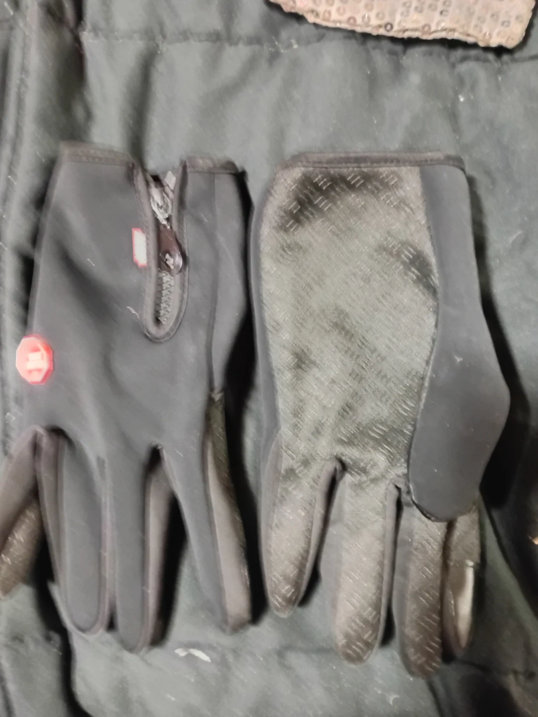 These black gloves feature a zipper closure for a snug fit. The palms have a textured grip pattern. Ideal for keeping your hands warm and providing extra grip during outdoor activities. Includes one pair of gloves.