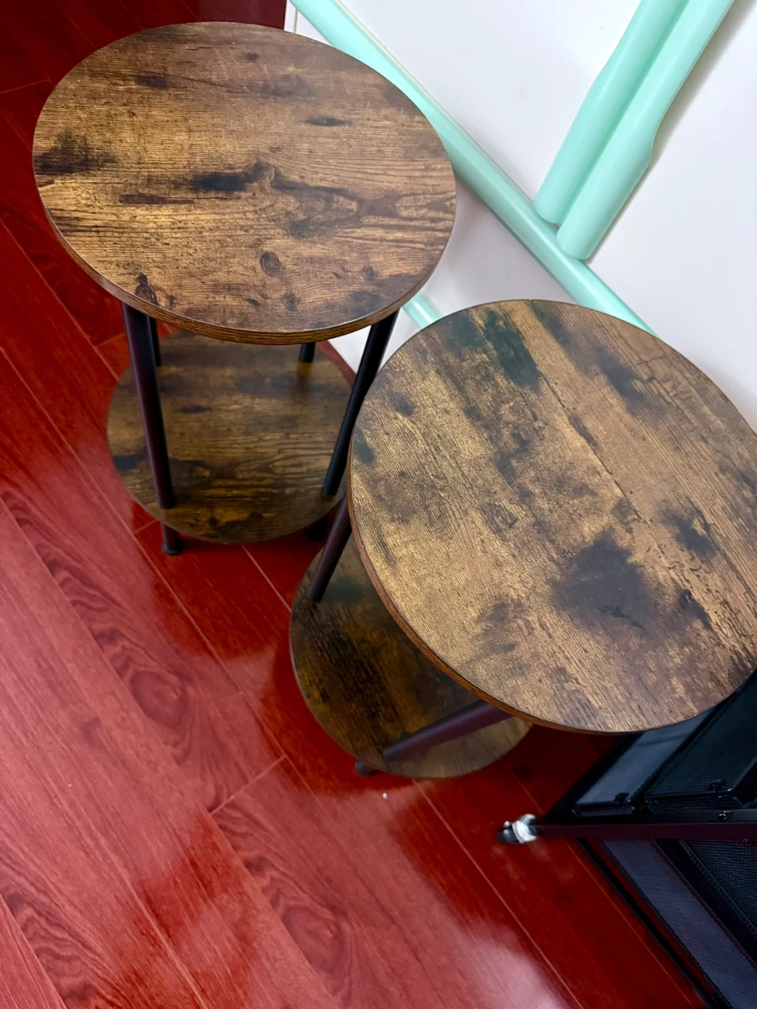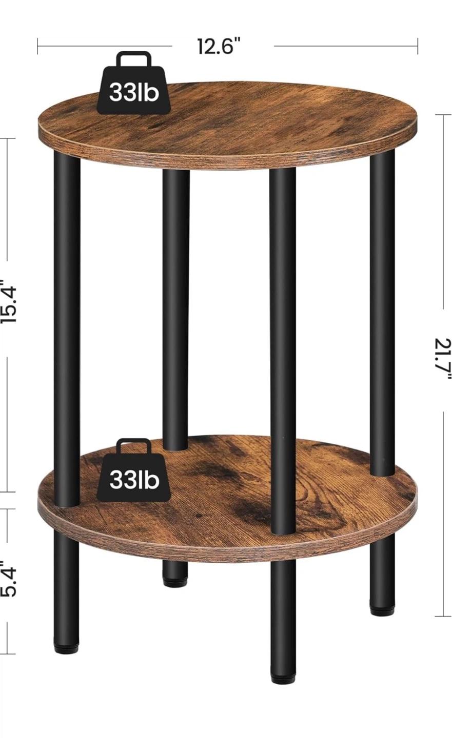 This is a set of two rustic brown round side end tables with black metal legs. Each table has two tiers and a weight capacity of 33lb per shelf. The dimensions for the larger table are 12.6" diameter and 21.7" height. These tables are great for plants or decor!
