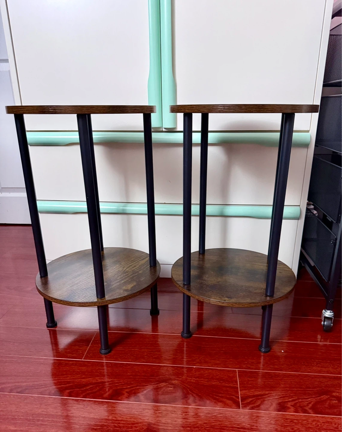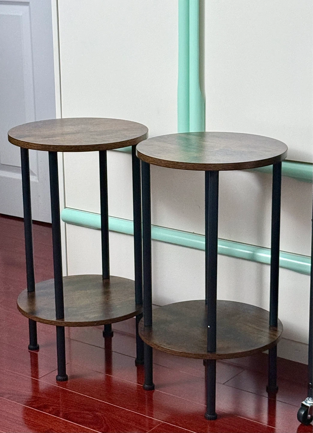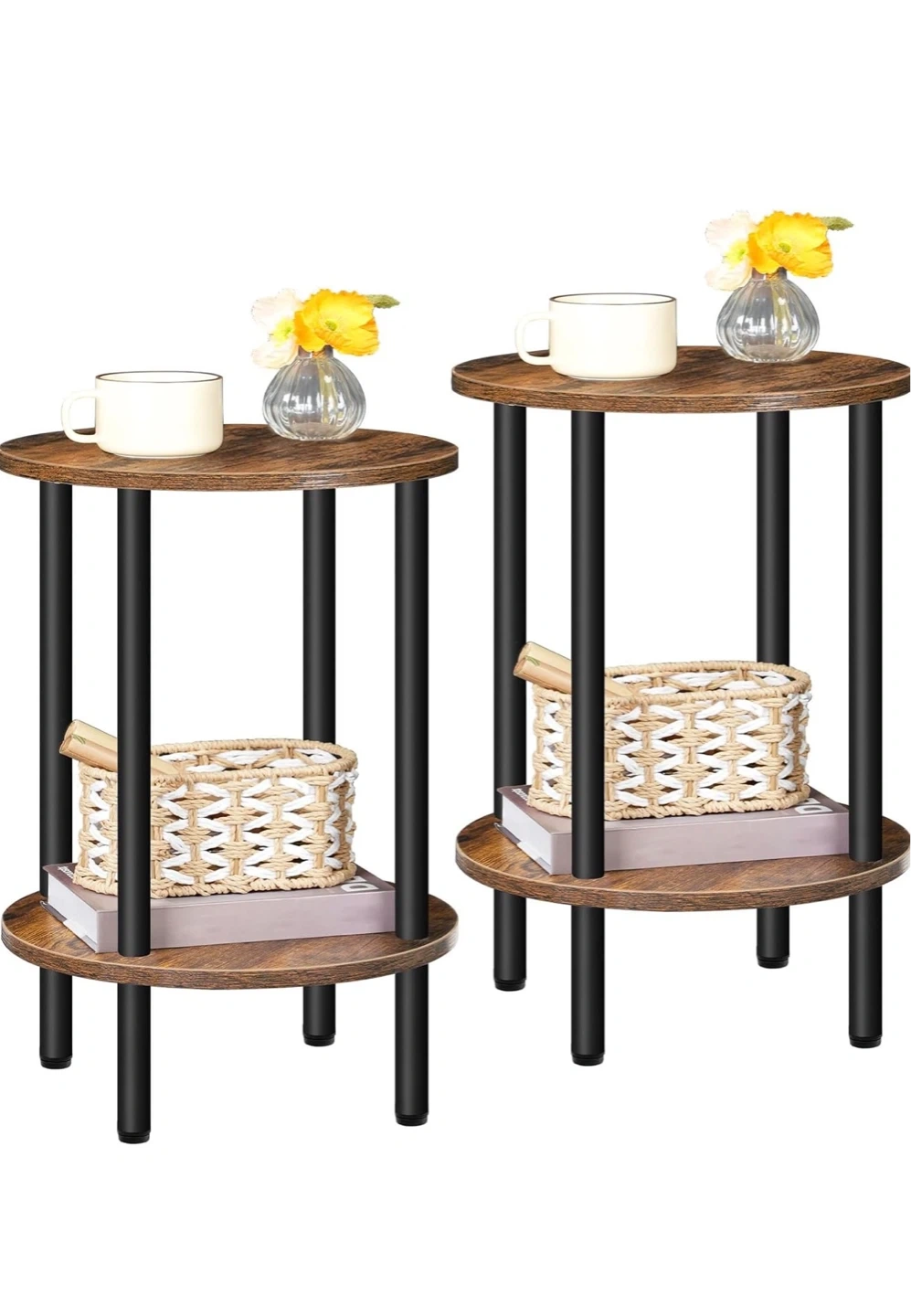 This is a set of two rustic brown round side end tables with black metal legs. Each table has two tiers and a weight capacity of 33lb per shelf. The dimensions for the larger table are 12.6" diameter and 21.7" height. These tables are great for plants or decor!