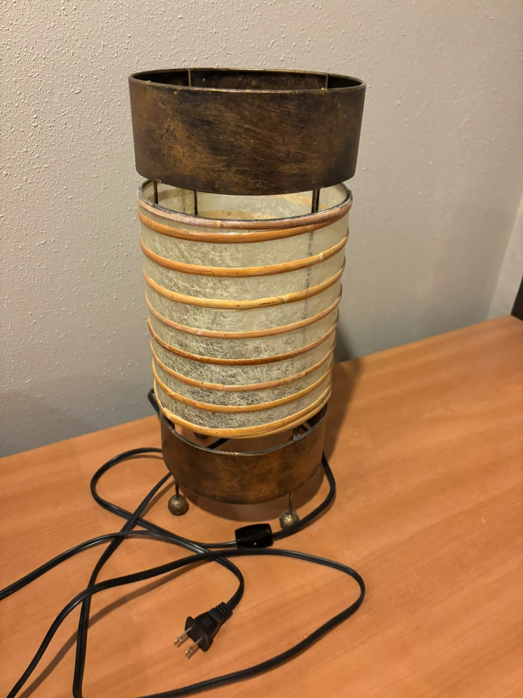 Selling a unique vintage-style table lamp! It has a cylindrical shade with horizontal bands and a bronze-coloured metal base and top. It's in great condition and would add a touch of retro charm to any room